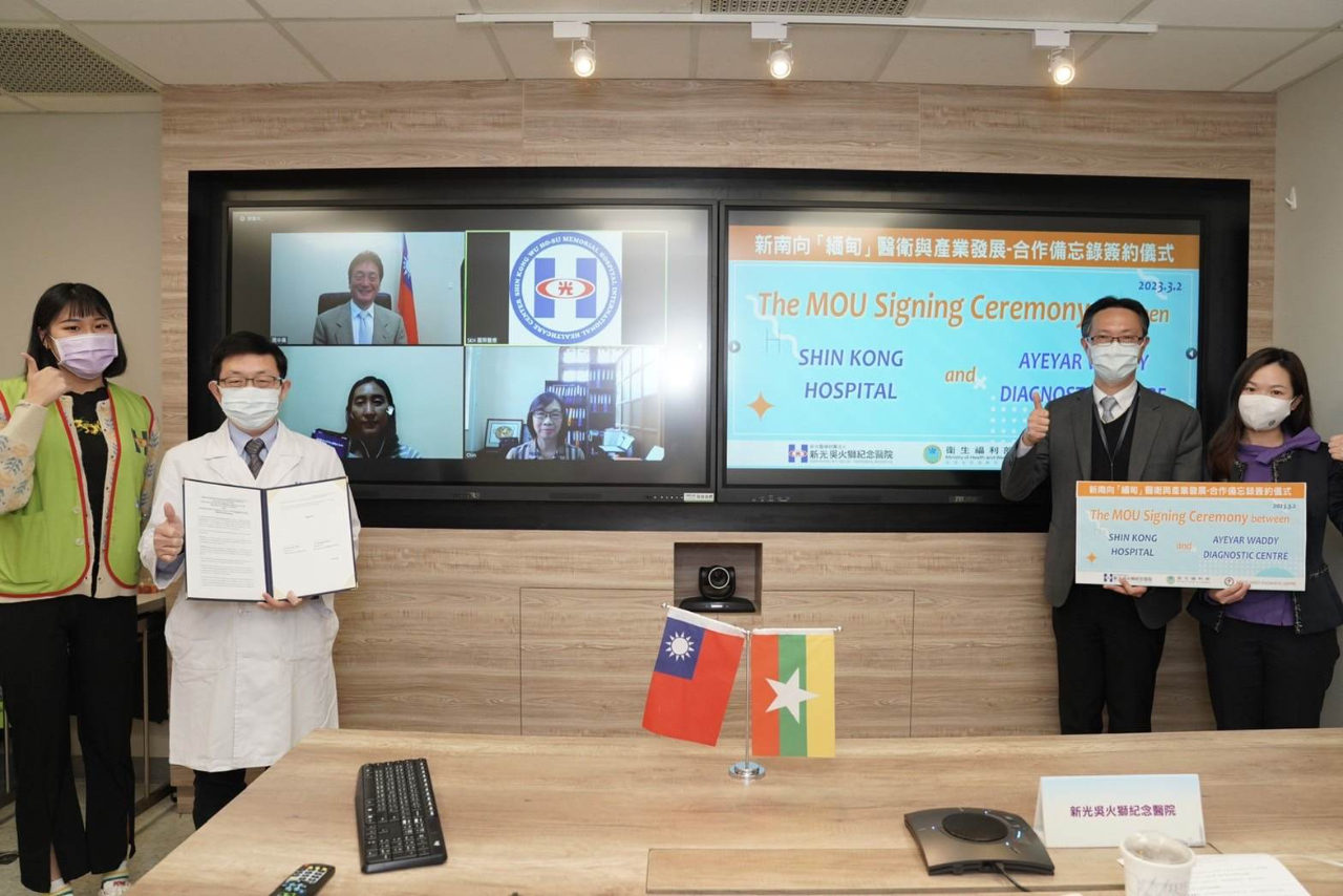 續擴大推動臺緬醫療衛生合作,新光吳火獅紀念醫院 (Shin Kong Wu Ho-su Memorial Hospital) 與緬甸克欽邦密支那市 Ayeyar Waddy Diagnostic Centre,兩方於3月2日舉行線上簽署儀式,分別由新光醫院國際醫療緬甸小組執行長許榮輝醫師與AWDC診所院長Dr. Myo Myo Lwin代表簽署合作備忘錄,駐緬甸代表處周中興大使見證。