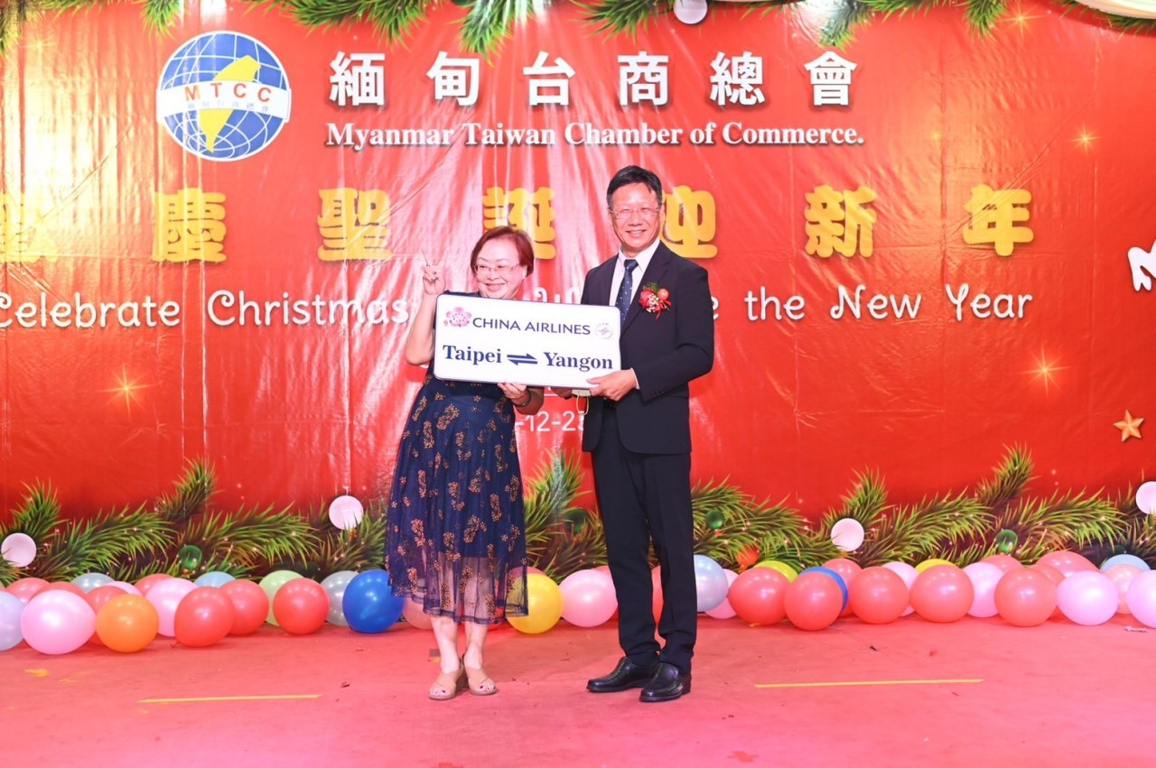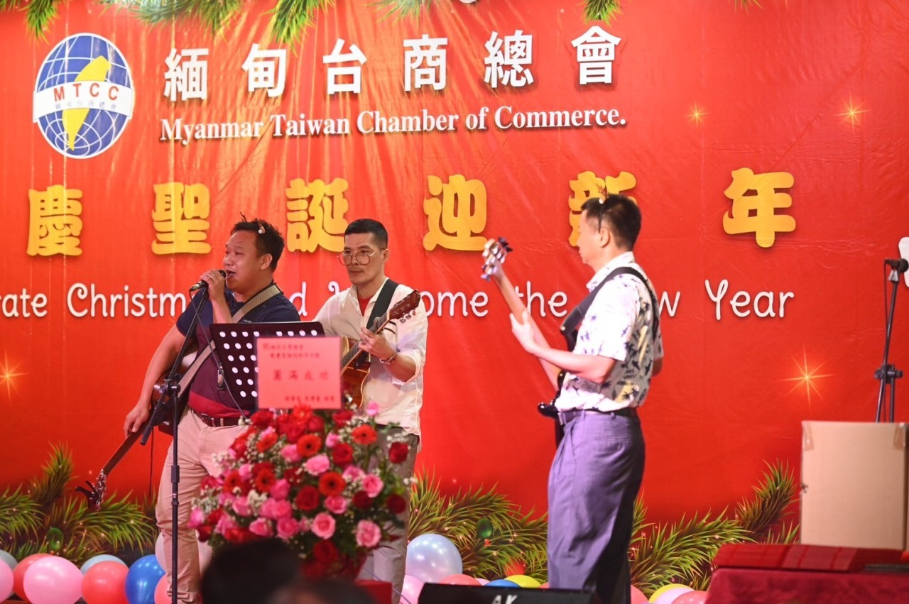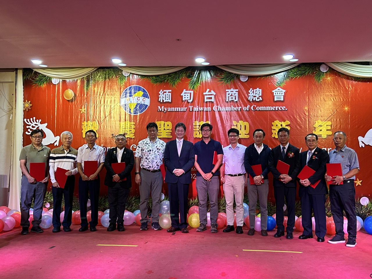 緬甸臺商總會12月23日舉行歡慶聖誕迎新年活動,駐緬甸代表處周大使中興偕同仁應邀出席與緬甸臺商總會長溫斯郎、副會長楊金彬、朱溥豪、黃國瑋、名譽總會長曾春雲、鄭建智、留文達、緬甸留臺同學總會名譽會長尹開濬,以及日本、馬來西亞、香港、福建商會、緬甸友人與臺商總會幹部會員約200人共慶聖誕佳節。