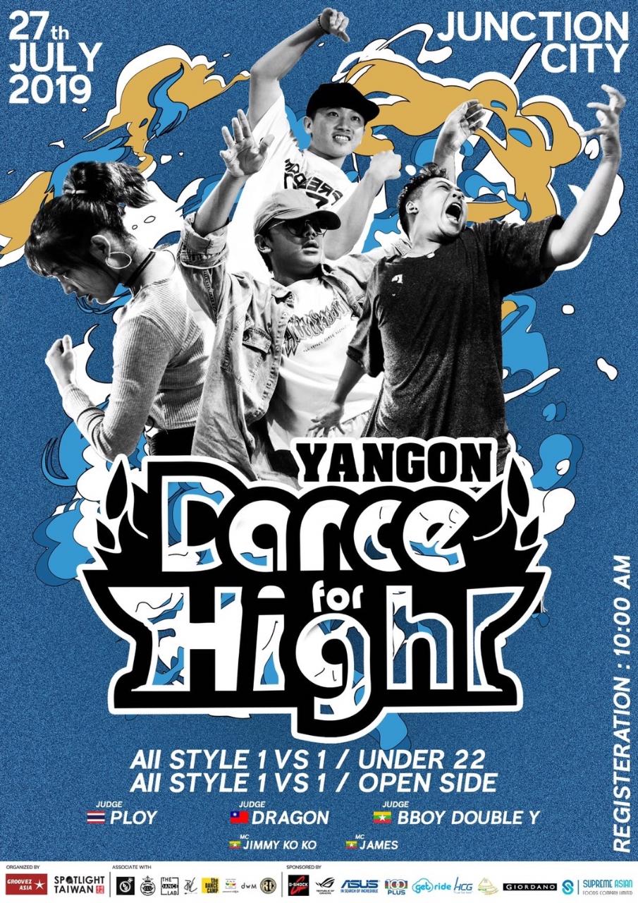 Yangon Dance For High是緬甸指標性的大型街舞賽事,也是緬甸目前唯一邀請台灣舞蹈老師擔任嘉賓的街舞活動,今年活動在仰光國際百貨商場並獲臺灣華碩ASUS及留台同學會代理之和成HCG等廠商共襄盛舉設攤並提供活動贈品,透過大型LED屏幕中展示臺灣意象及齊柏林導演的「看見台灣」作品,活動在各國/臺灣選手的旗幟揮洋下進行,現場超過七千人次欣賞到這場由台灣人所舉辦的街舞嘉年華,加深緬甸與台灣文化交流。