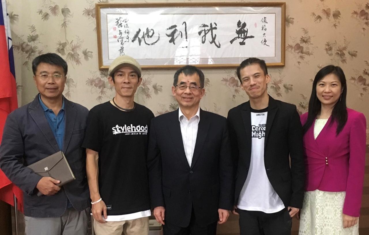 駐緬甸代表張俊福與緬甸街舞藝術家張阜康/臺灣評審林浤龍及駐緬代表處副參事張水庸、秘書曾靖惠就本年街舞交換意見並合影