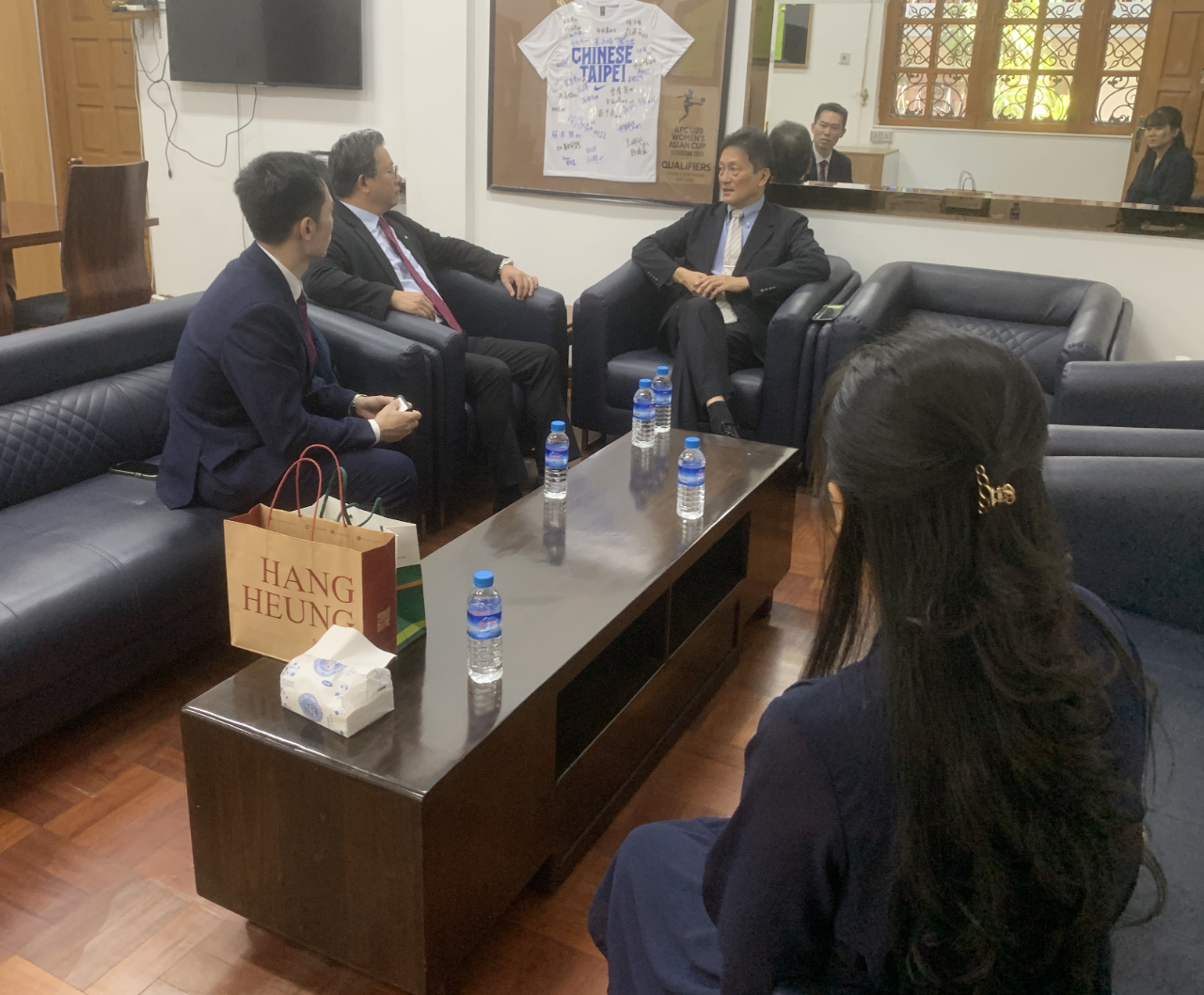 第一銀行仰光代表辦事處新任的陳宥丞首席代表與一銀寮國永珍分行的陳師群經理,於3月5日拜會駐緬甸代表處周中興代表,就緬甸政經現況等議題交換意見。