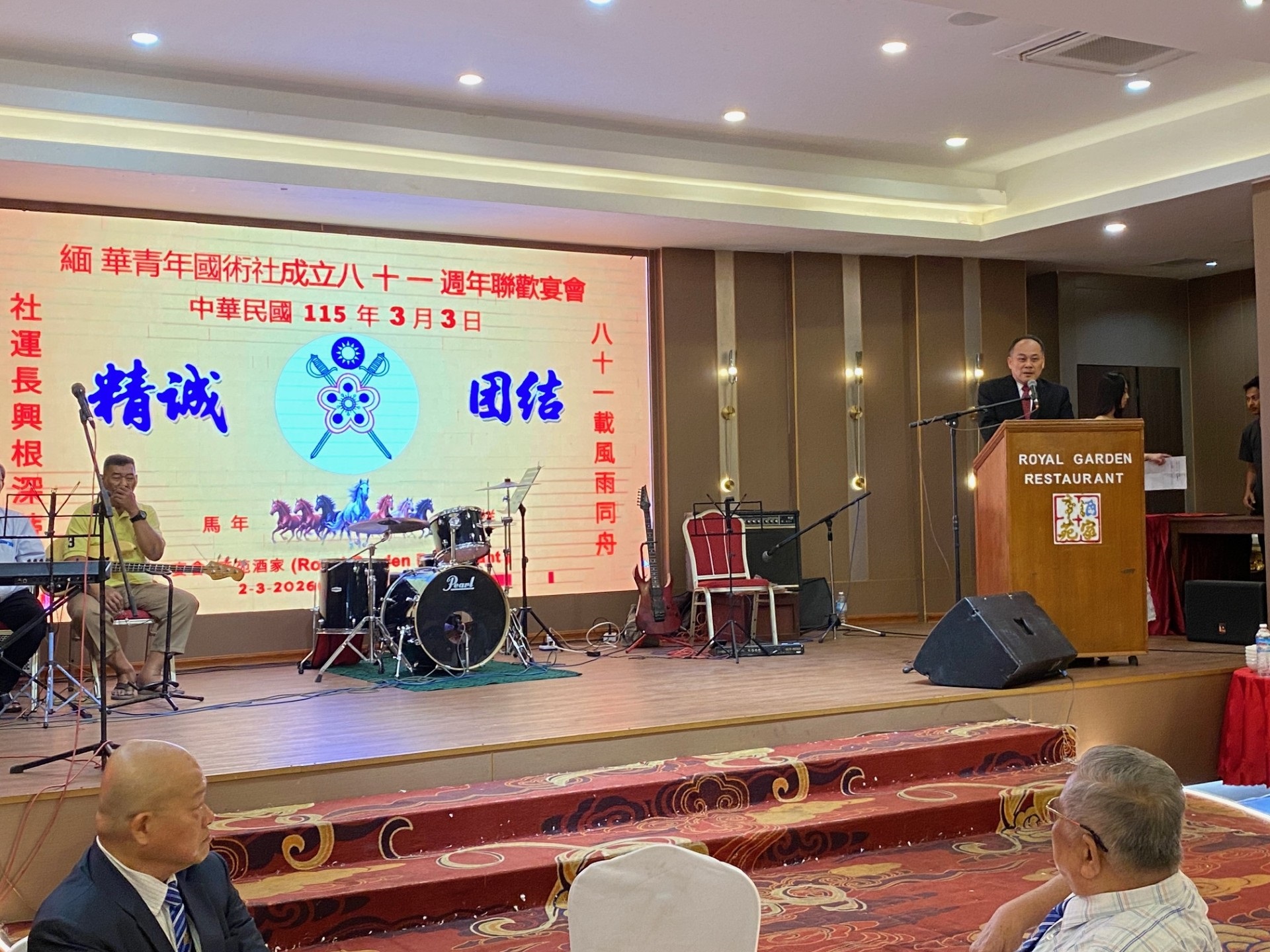 駐緬甸代表處黃敏境代表偕官大鉎副組長應邀出席緬華青年國術社於本(2026)年3月2日晚舉行之該社成立81週年聯歡宴會,宴會由該社社長張建武主持,與會者計有建德總社大董黃慶燕、緬華自由青年總社理事長尤福臨、國術社社員及各僑團代表約300人。