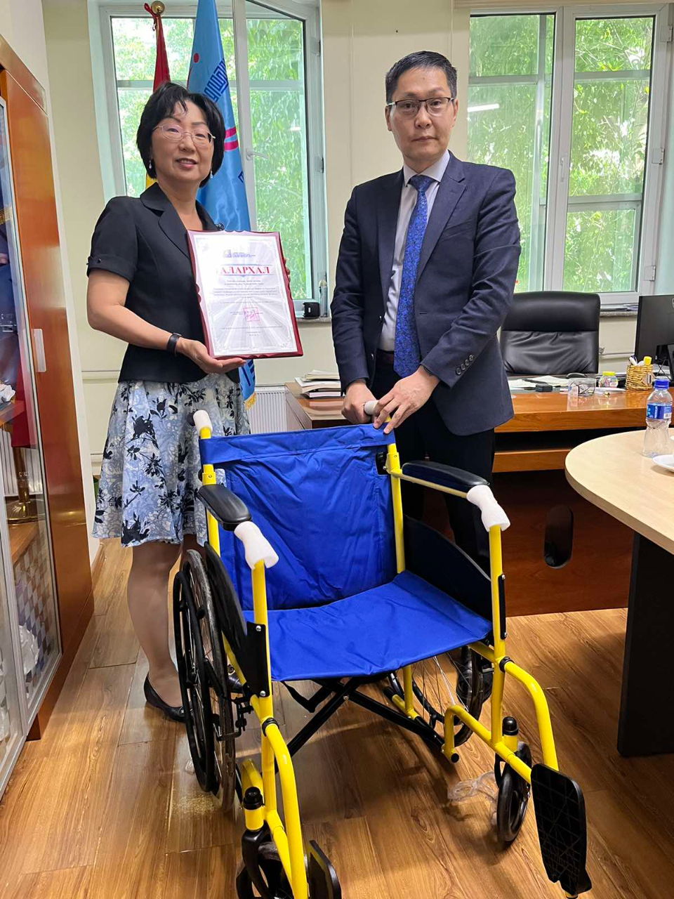蒙古身障發展局長NYAMSUREN TS.於捐贈儀式上表示,非常感謝臺灣民眾的愛心,致贈該協會成人用輪椅、兒童用輪椅、助行器、鋁手杖及盲杖等共107具身障輔具,該協會表示本次捐贈醫療輔具品質佳,將會儘速把這批捐贈物品轉交至最有需要的蒙古身障人士手中,亦會與駐蒙古代表處保持密切合作。