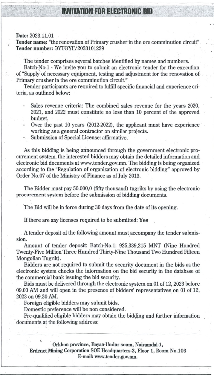 "the renovation of Primary crusher in the ore communication circuit" will open in the presence od bidders' representatives on 01 of 12, 2023 on 09.30 AM.
