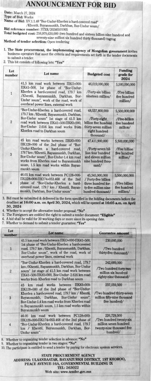 The bid will be opened at 16:05 a.m. on April 30, 2024