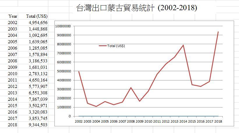 2018年臺灣對蒙出口金額達 9,344,503美元,約為2017年的2.5倍,亦創下2002年臺灣在蒙古設置代表處以來的歷史新高(7,867,039美元,2014年);2019年我國對蒙古出口金額約494.15萬美元。2020年1月至10月,我國對蒙古出口金額約393.40萬美元。我國出口蒙古之主要產品包括資訊與影音視聽產品、生產機械、醫藥品、電機設備及其零件、塑膠與橡膠相關製品,以及光學、照相與精密儀器設備、內科或外科儀器與器具、服飾、玩具、遊戲與運動用品等。