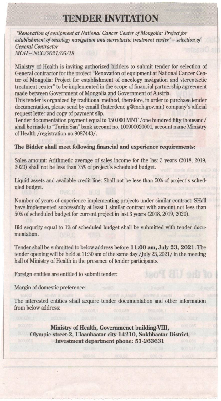 "Renovation of equipment of National Cancer Center of Mongolia: Project for establishment of oncology navigation and stereotactic treatment center" selection of General Contractor, before 11:00 AM, July 23, 2021 bid4
