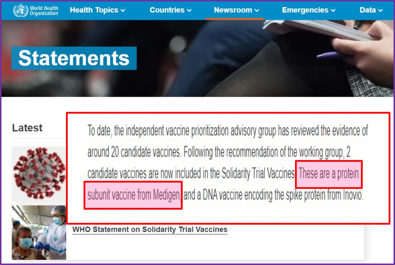 WHO的官網聲明指出,候選疫苗是由一支獨立的疫苗專業評估小組所評選,迄今已審查約20款新疫苗,除運用次單元重組蛋白技術的臺灣高端疫苗,另一款入選的是美國Inovio藥廠的DNA疫苗。臨床試驗將在前述三國境內超過40個臨床試驗中心執行。該計畫旨在開發出更高功效的第二代疫苗,以針對變種病毒提供更完善保護及更長保護時效。