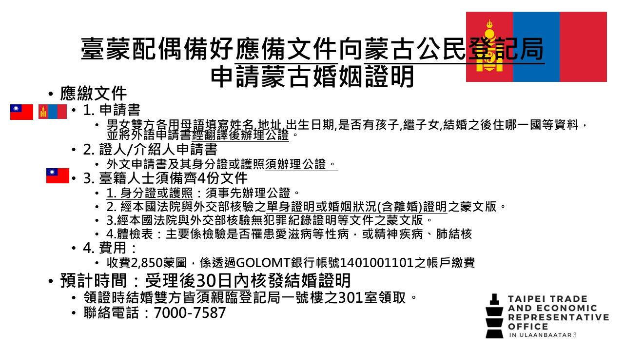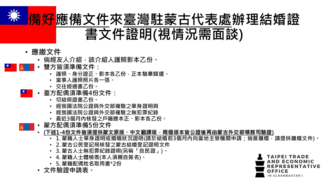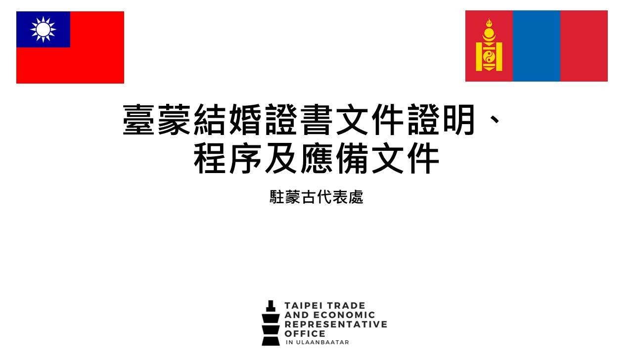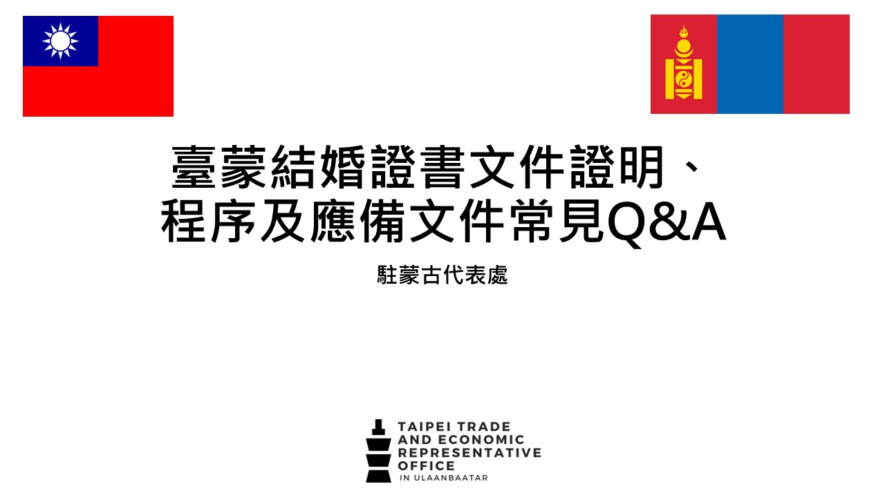 臺蒙結婚證書文件證明、程序及應備文件及常見Q&A - 駐烏蘭巴托台北貿易經濟代表處 Taipei Trade and Economic Representative Office in Ulaanbaatar ::: 跳到主要內容區塊
