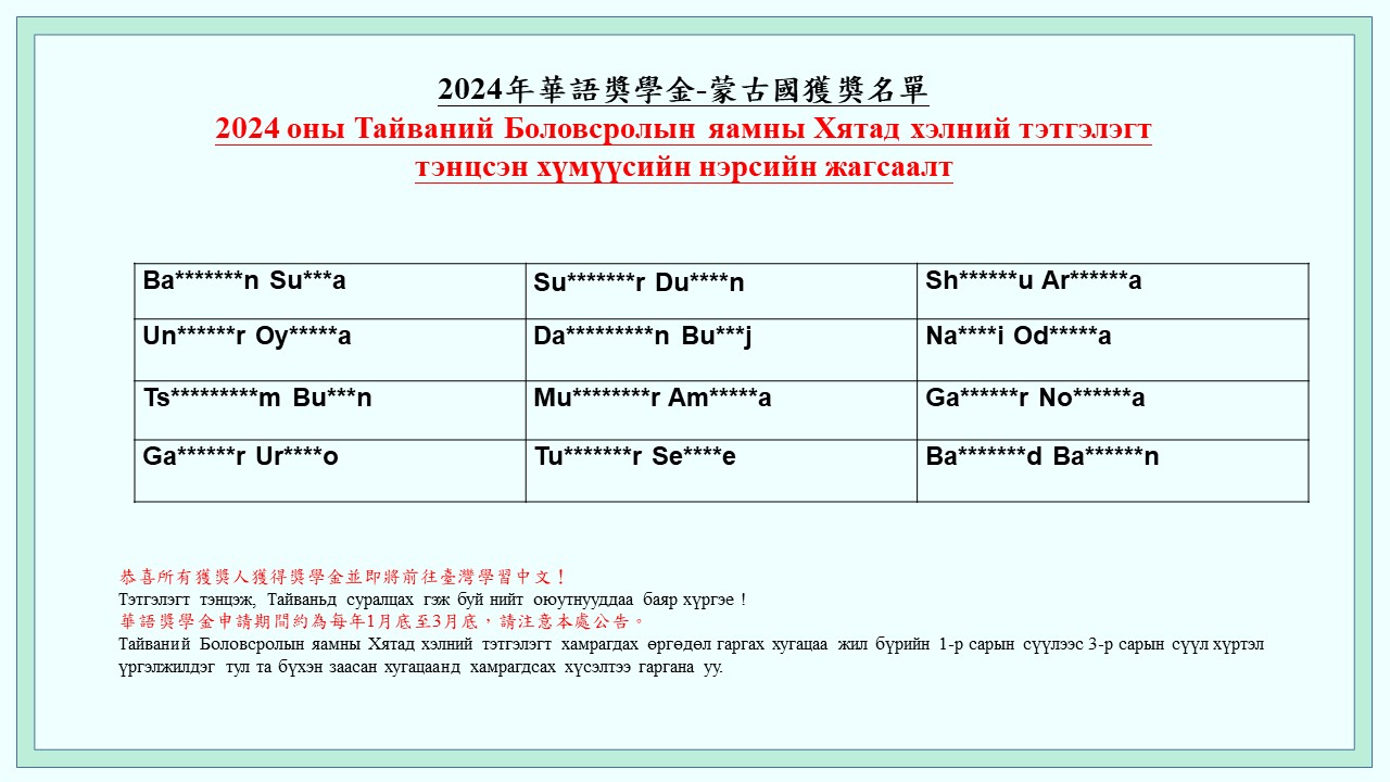 Тайваний Боловсролын яамны Хятад хэлний тэтгэлэгт хамрагдах өргөдөл гаргах хугацаа жил бүрийн 1-р сарын сүүлээс 3-р сарын сүүл хүртэл үргэлжилдэг тул та бүхэн заасан хугацаанд хамрагдсах хүсэлтээ гаргана уу.