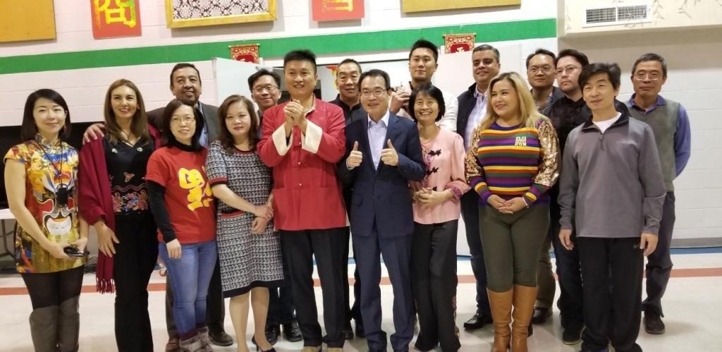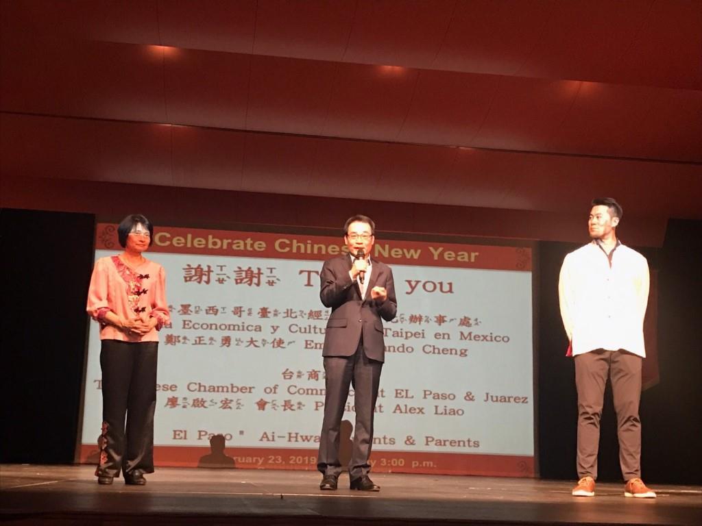 為慶祝豬年新春及關心僑商事業發展,中華民國駐墨西哥代表處鄭代表正勇應邀偕經濟組許組長銘松、政務組徐秘書韶慧及墨西哥臺貿中心陳主任立田於本(108)年2月23日赴美墨邊境美國德州El Paso市(鄰近墨西哥Juárez市)參加艾華中文學校豬年暨20周年慶祝會及Juárez台商會舉辦之豬年新春聯歡晚會。