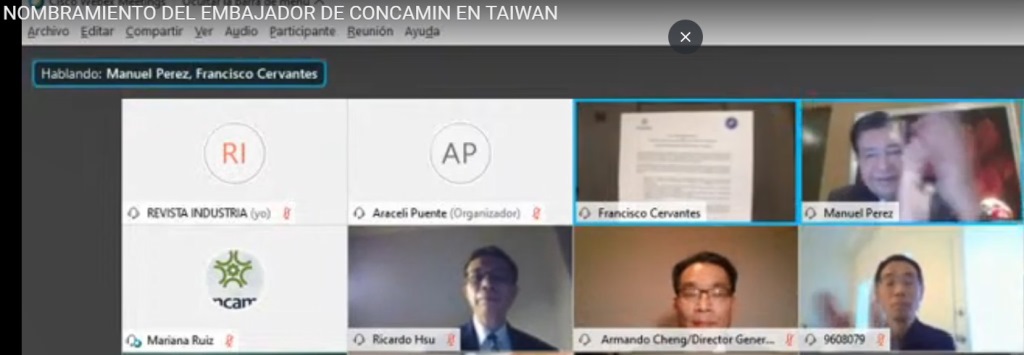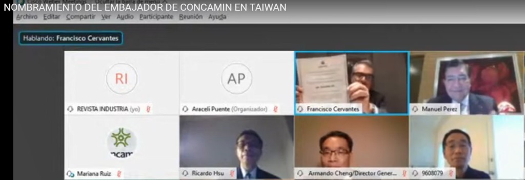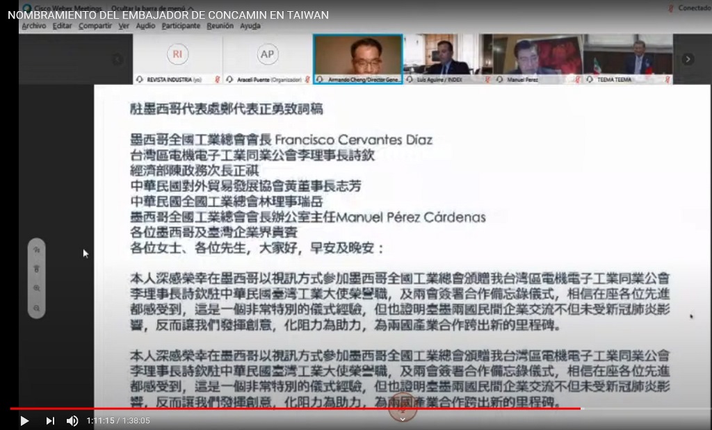墨西哥全國工業總會於墨西哥時間本(2020)年8月12日晚間8時(臺北時間8月13日上午9時)舉行頒贈我台灣區電機電子工業同業公會李理事長詩欽該會駐中華民國臺灣工業大使榮譽職暨兩會簽署合作備忘錄儀式。