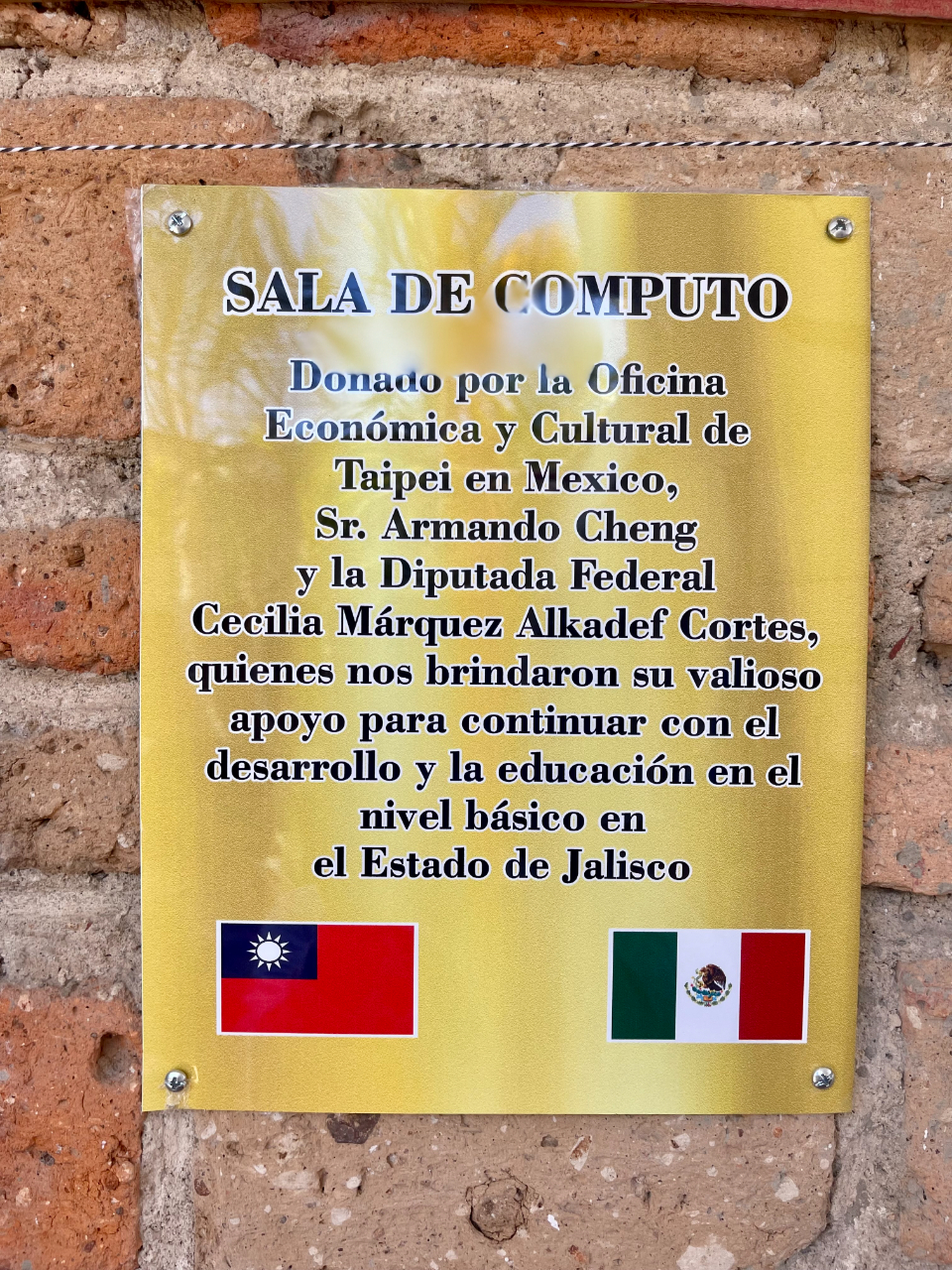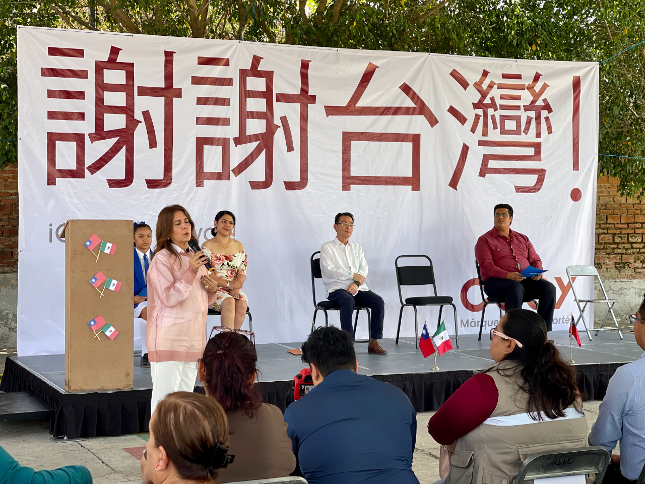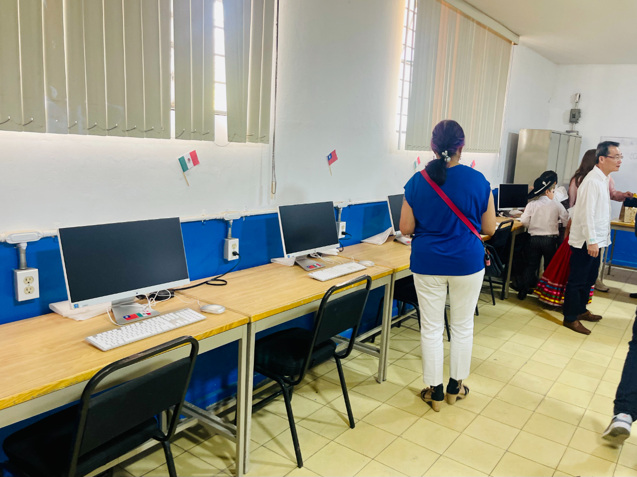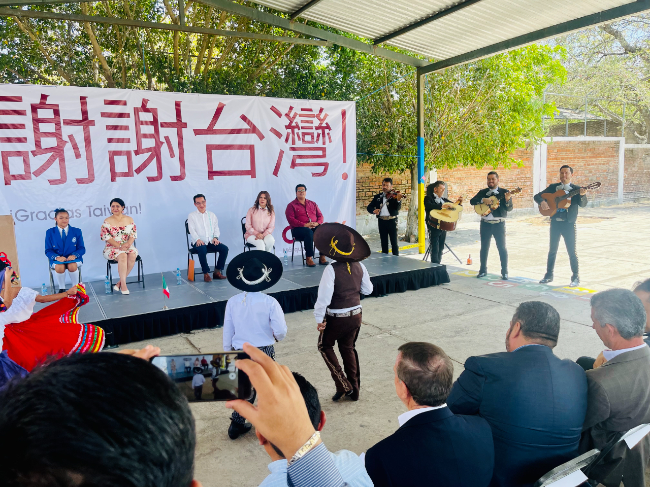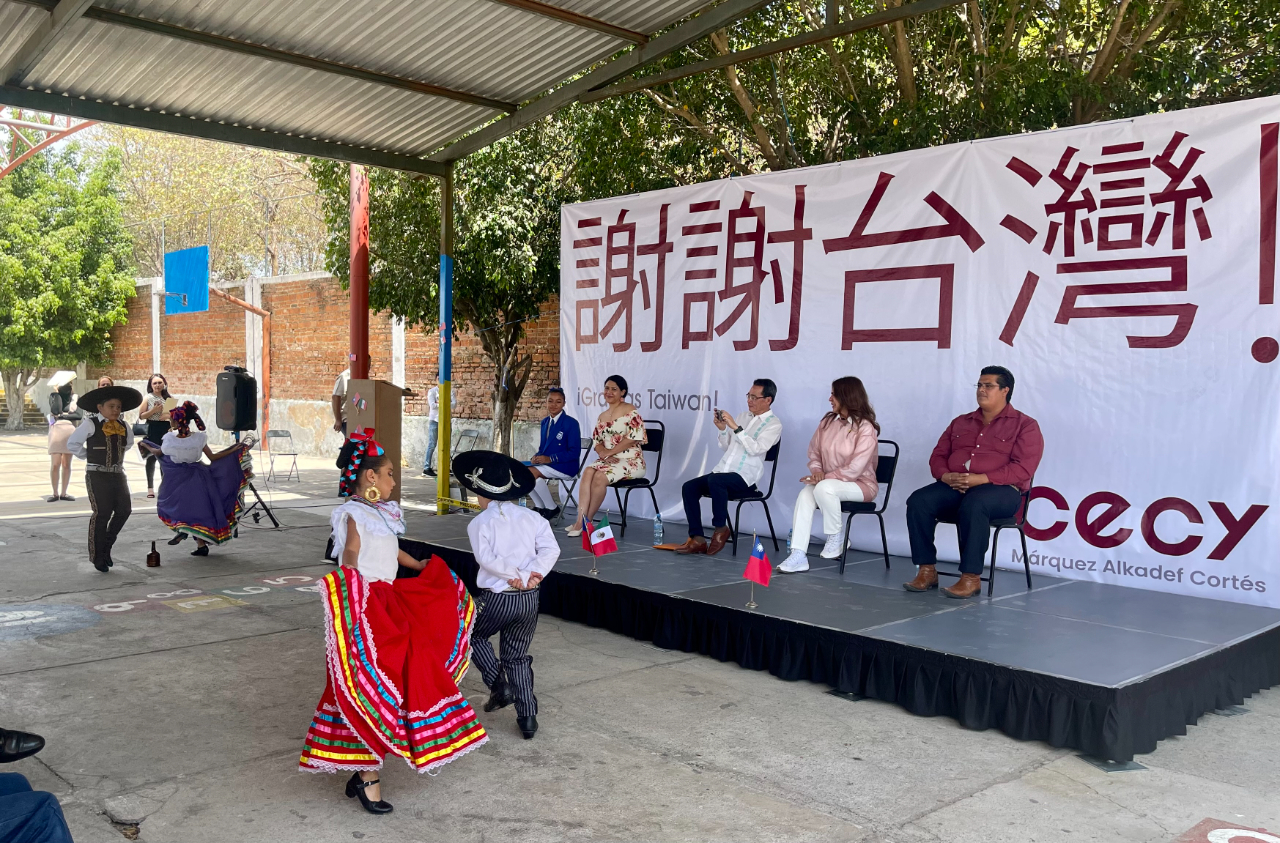 儀式間,受贈學童特別排練表演民俗舞蹈,並用彩帶道具排列臺灣國旗圖案,與主席臺上巨幅「謝謝台灣」的國字背板相互呼應。之後,鄭代表會同瑪爾奎絲副主席將輪椅贈交身障代表,並前往用這次計畫的資訊設備所設立的電腦教室,主持剪綵和標示臺墨國旗掛牌的揭牌儀式,讓師生們開始全新的學習體驗,更加認識臺灣。