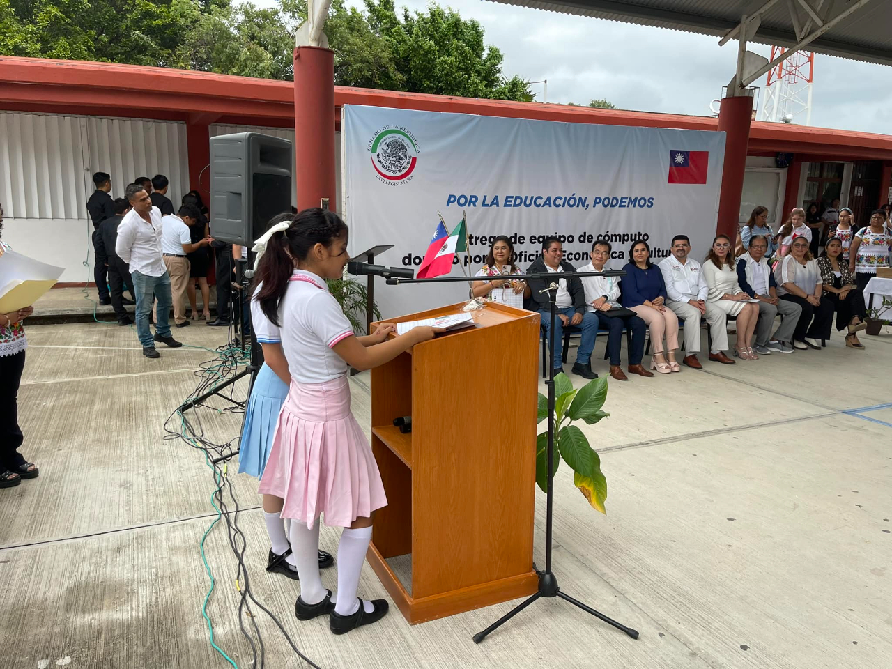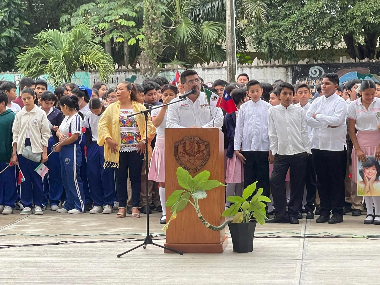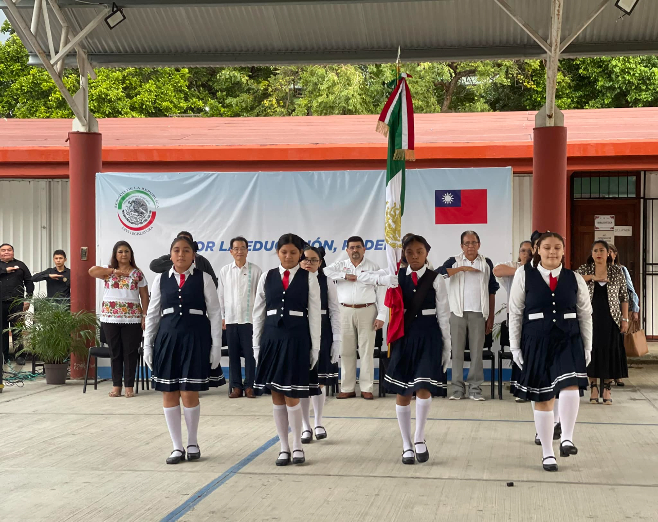 典禮由嘉賓在印有我國大面國旗的背板前舉行朝會揭開序幕,接著由馬林校長代表全體師生致歡迎詞,感謝來自台灣兄弟之邦的協助,表示很榮幸能見證台墨雙邊合作提升教育品質的歷史時刻;瑪汀內絲參議員致詞感謝台灣愛心,表示適逢「國際教育日」前夕,這一次的教育合作計畫,是打開學生國際視野、促進兩國交流的最佳途徑。