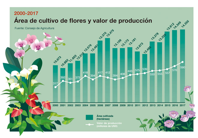El sector de la floricultura de Taiwan ha experimentado un crecimiento estable en la última década gracias al aumento de la demanda interna y al mayor acceso a los mercados extranjeros. Las estadísticas del COA muestran que la tierra agrícola para el cultivo de flores ocupaba 14.355 hectáreas en 2017, en comparación con 10.973 hectáreas en 2000. El valor total de la producción de la industria alcanzó TWD 17.700 millones (USD 590 millones) el año pasado, mientras que las flores superaron a todos los demás productos agrícolas en ingresos por hectárea.