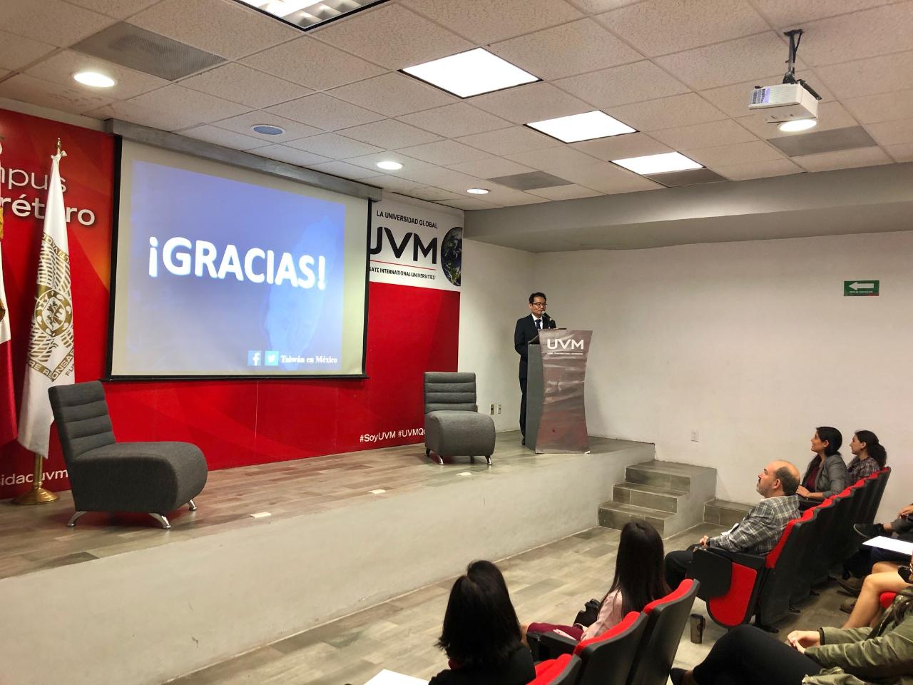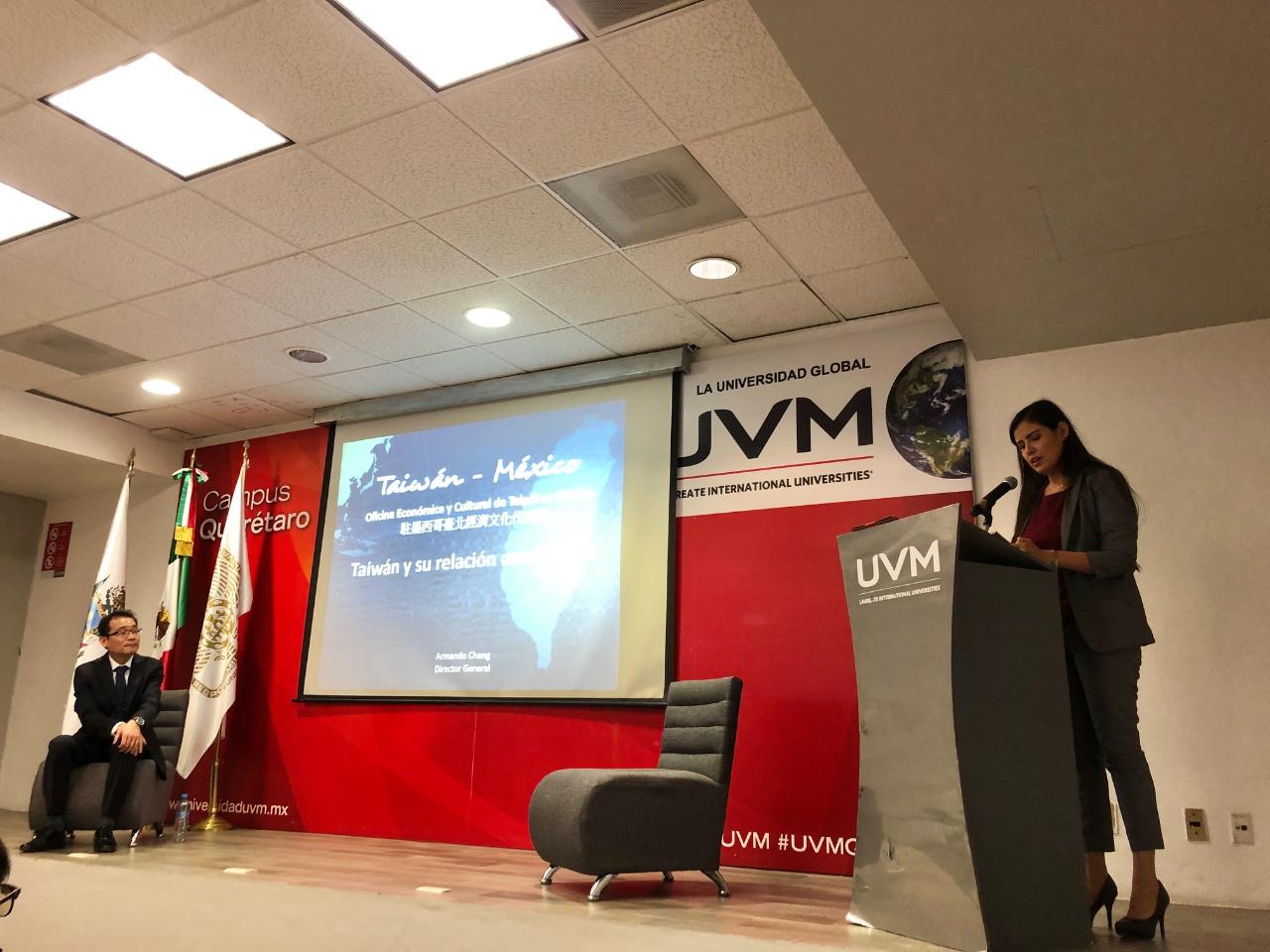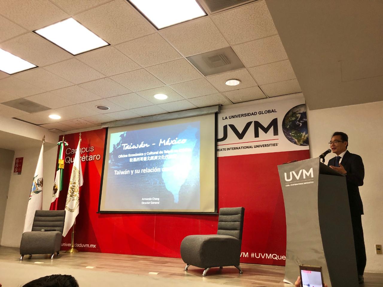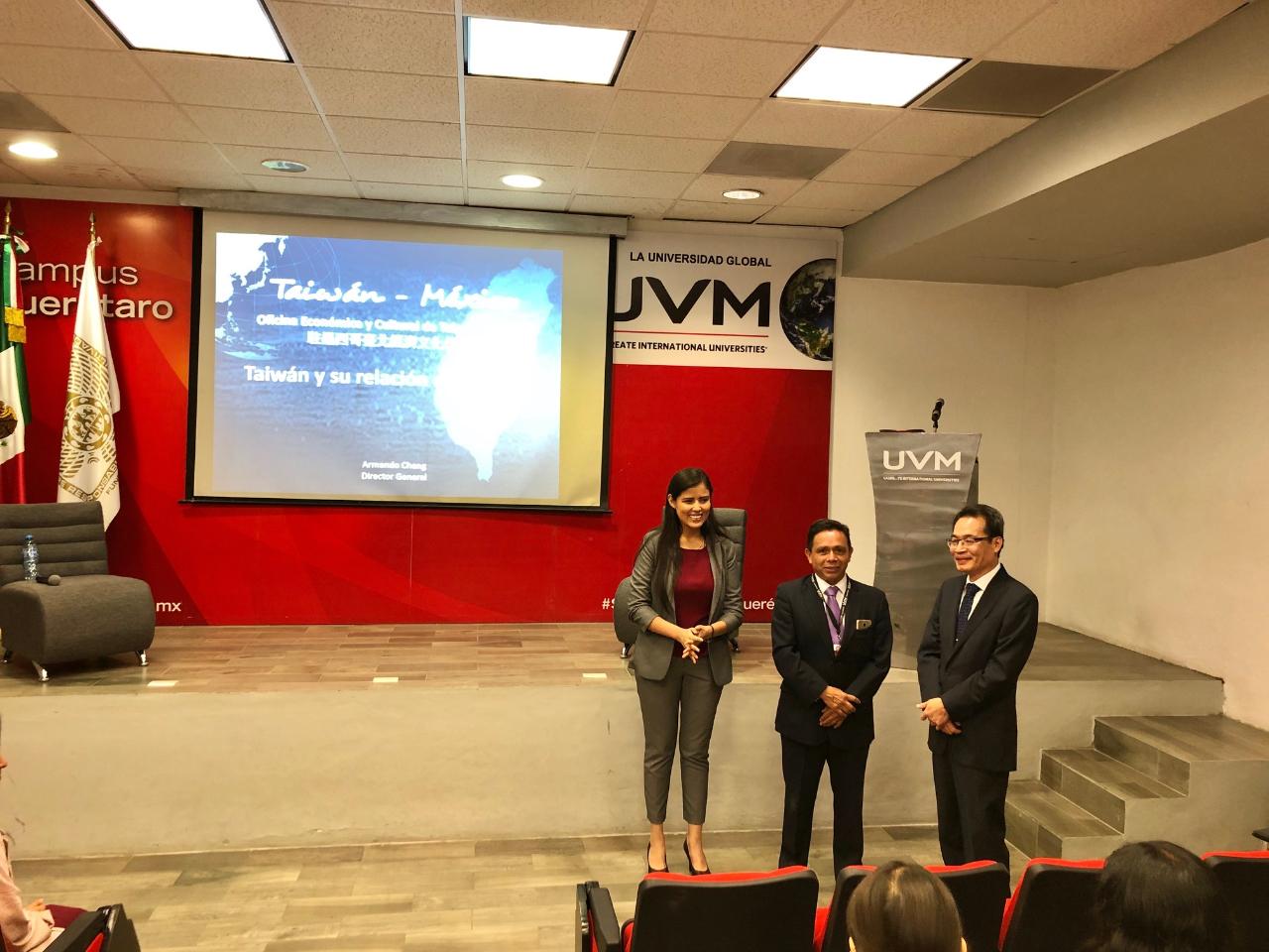 El día 12 de Noviembre del presente año el Director General de la Oficina Económica y Cultural de Taipéi en México el Mtro. Armando Cheng, se reunió con estudiantes de la Universidad del Valle de México Campus Querétaro, con motivo de compartir con ellos la relación que existe entre México y Taiwán. Igualmente temas de contacto, promoción y difusión de las oportunidades para México fueron enfatizados con autoridades y académicos de la Universidad.