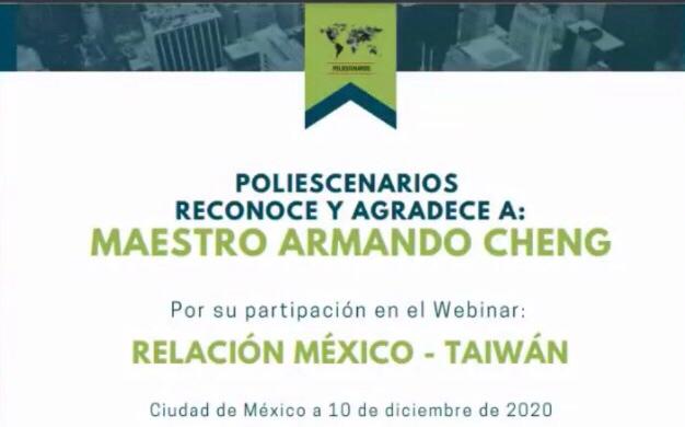 El día de ayer 10 de Diciembre de 2020, se llevo a cabo una entrevista online con el Mtro. Armando Cheng, Representante General de la Oficina Económica y Cultural de Taipéi en México junto con Poliescenarios un espacio de reflexión y análisis internacional conformado por académicos y egresados de Negocios Internacionales del IPN, con el objetivo de dar respuesta a los fenómenos que afectan al mundo, desde una perspectiva global, imparcial y académica.