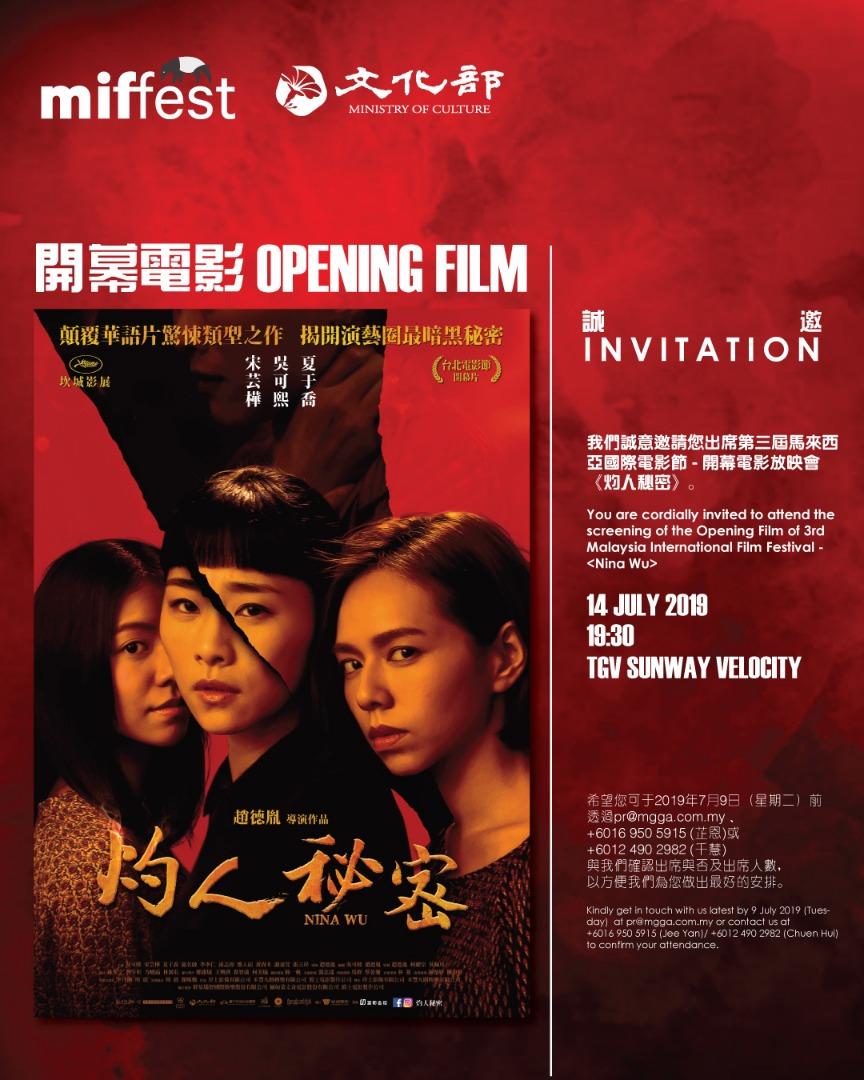 今年的馬來西亞第3屆國際電影節MIFFEST邀請到臺灣4部電影前來觀摩,分別是『灼人的秘密』、『你的臉』、『小美』與『引爆點』,而『灼人的秘密』更受邀為影展開幕片。欲觀賞者請至電影節官方網站查詢放映訊息http://www.mgga.com.my/miffest/year2019/screening-schedule/