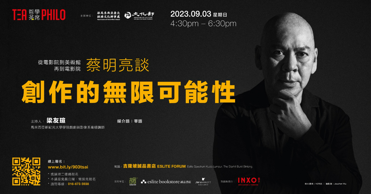 本處文化組與雲手文創基金會合辦「哲學茶席」,為一系列介紹臺灣人文、哲學、人文及藝文思潮的講座。2023年9月3日將邀請蔡明亮於吉隆坡誠品講堂以「從電影院到美術館再到電影院:蔡明亮談創作的無限可能性」為題,與觀眾分享他一路走來,對創作、對電影,以及對美學和藝術養成的思考與實踐。本次是他睽違多年回到馬來西亞舉行公開講座,將與觀眾分享從影30年來作品變與不變之處,講座將由馬來西亞新紀元大學學院戲劇與影像系講師梁友瑄主持。