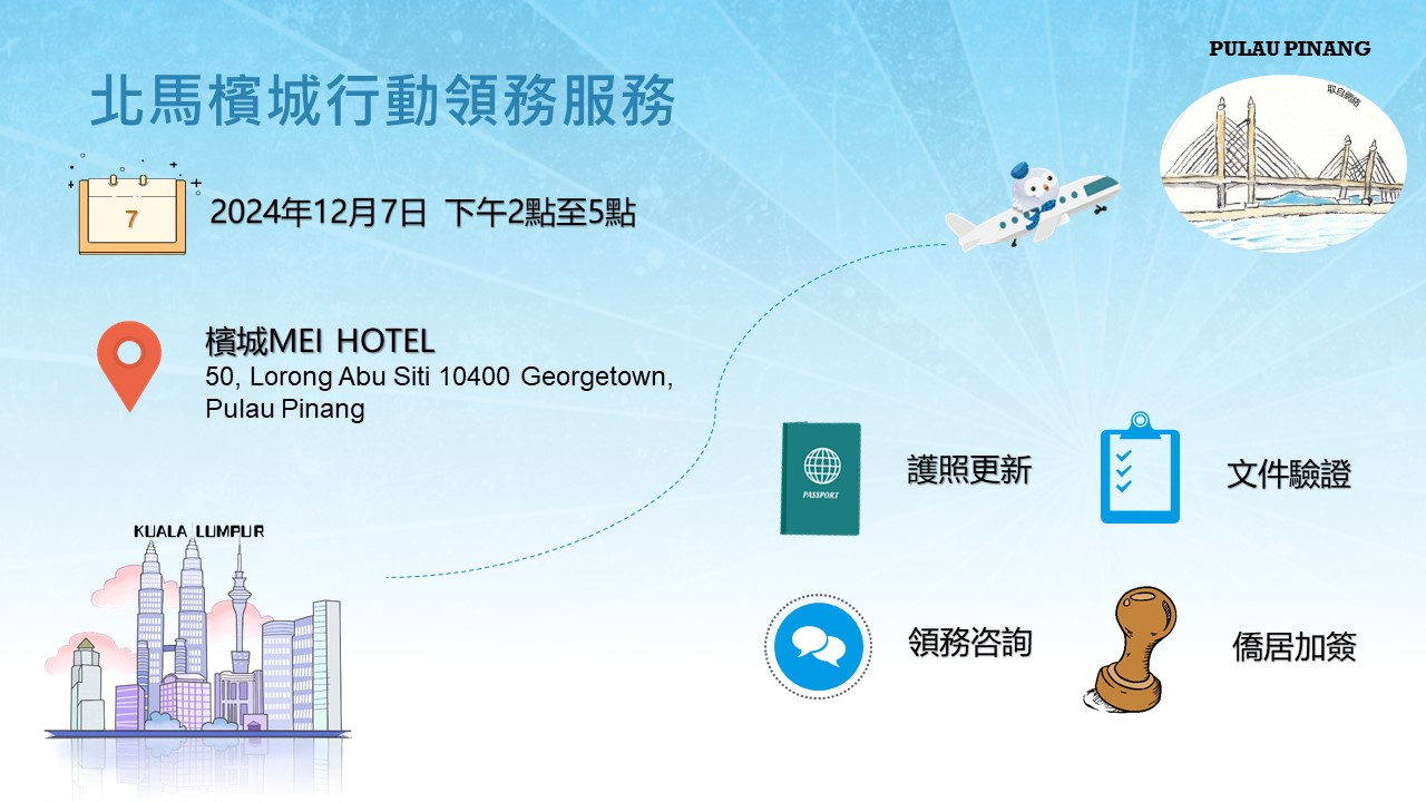 為服務北馬檳城及鄰近州屬僑民,本處於113年12月7日假檳城Mei Hotel辦理行動領務,受理護照更新、文件驗證、僑居加簽及領務諮詢服務,頗受好評。