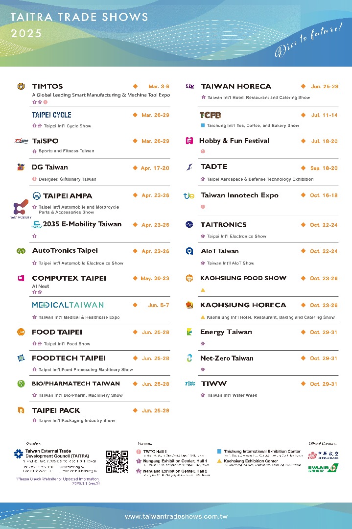 外貿協會 (TAITRA) 將於 2025 年舉辦 25 場國際專業展,匯聚來自各行各業的 超過 80,000 名國際買主。