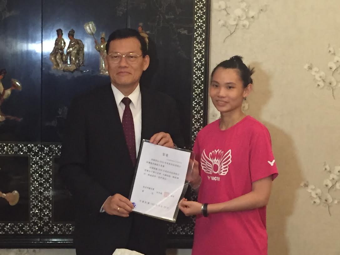 章大使計平轉頒教育部體育署何卓飛署長賀電予「2016馬來西亞羽球公開賽」女子單打組亞軍戴資穎。