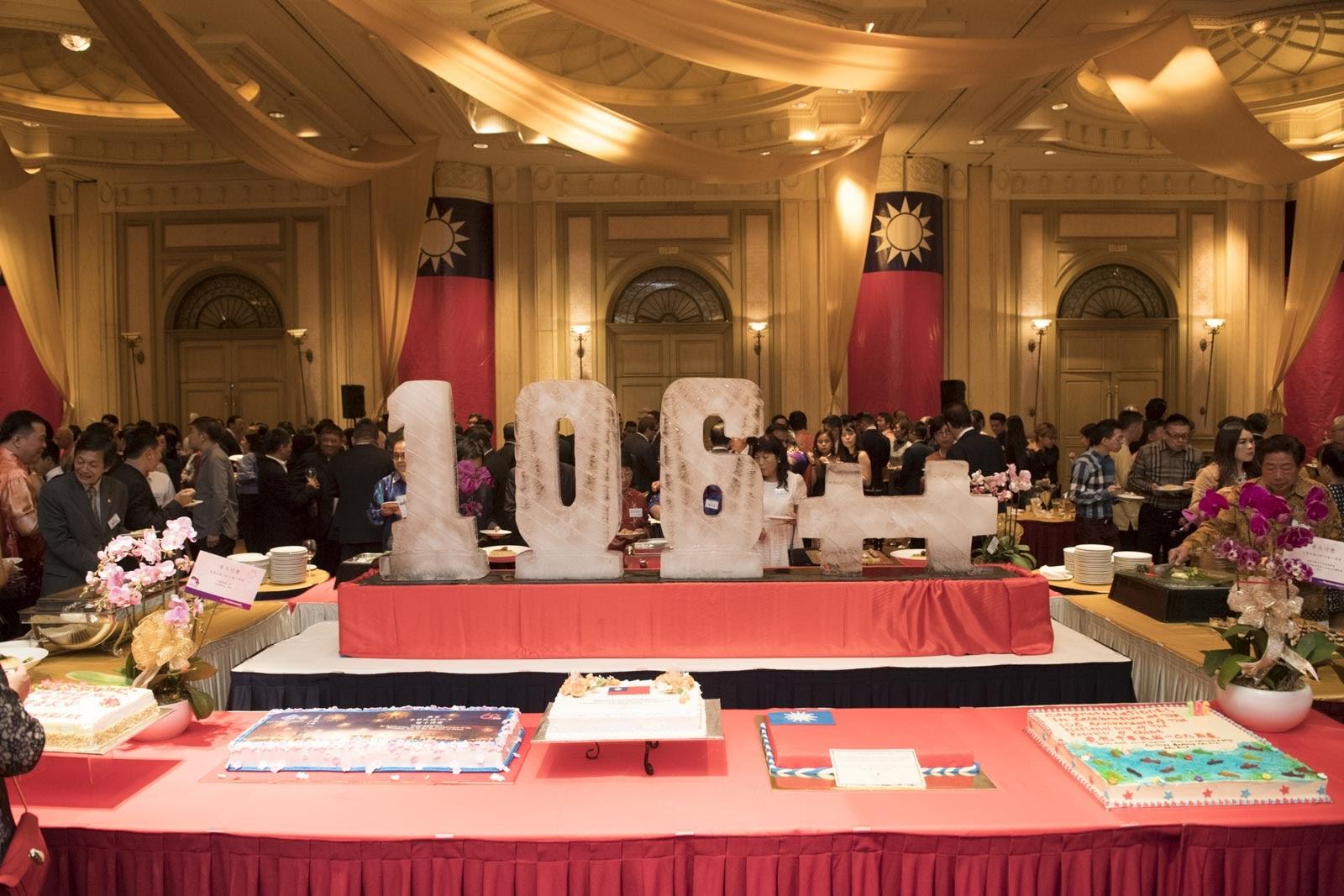 酒會現場以大型106與雙十標幟之冰雕作為裝飾