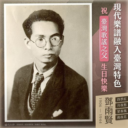 今天(7/21)是經典名曲〈四季紅〉、〈月夜愁〉、〈望春風〉、〈雨夜花〉等作的作曲人,鄧雨賢先生的116歲冥誕。將臺灣民間元素融入西方樂譜,創作傳唱至今,鄧雨賢先生的音樂成就,讓他被後人尊為「#臺灣歌謠之父」。