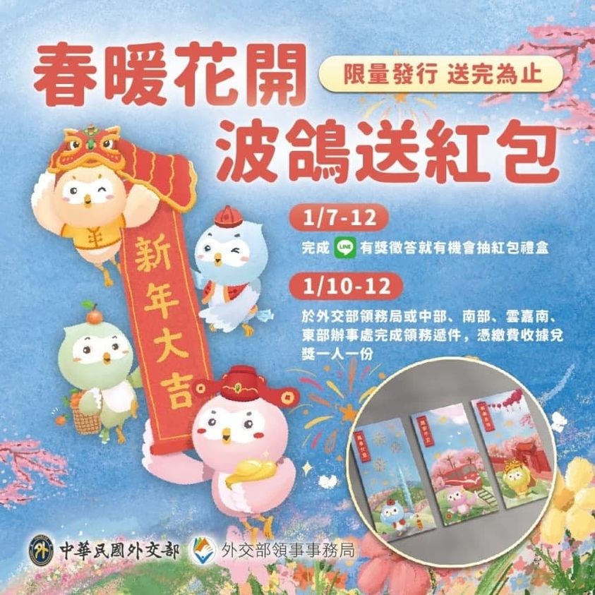 1/10至1/12到領務局或台中、嘉義、高雄、花蓮四個辦事處申辦護照、簽證或文件驗證並完成繳費,就可以憑繳費證明領取波鴿紅包禮盒組呦 (限量發行、一人一份)