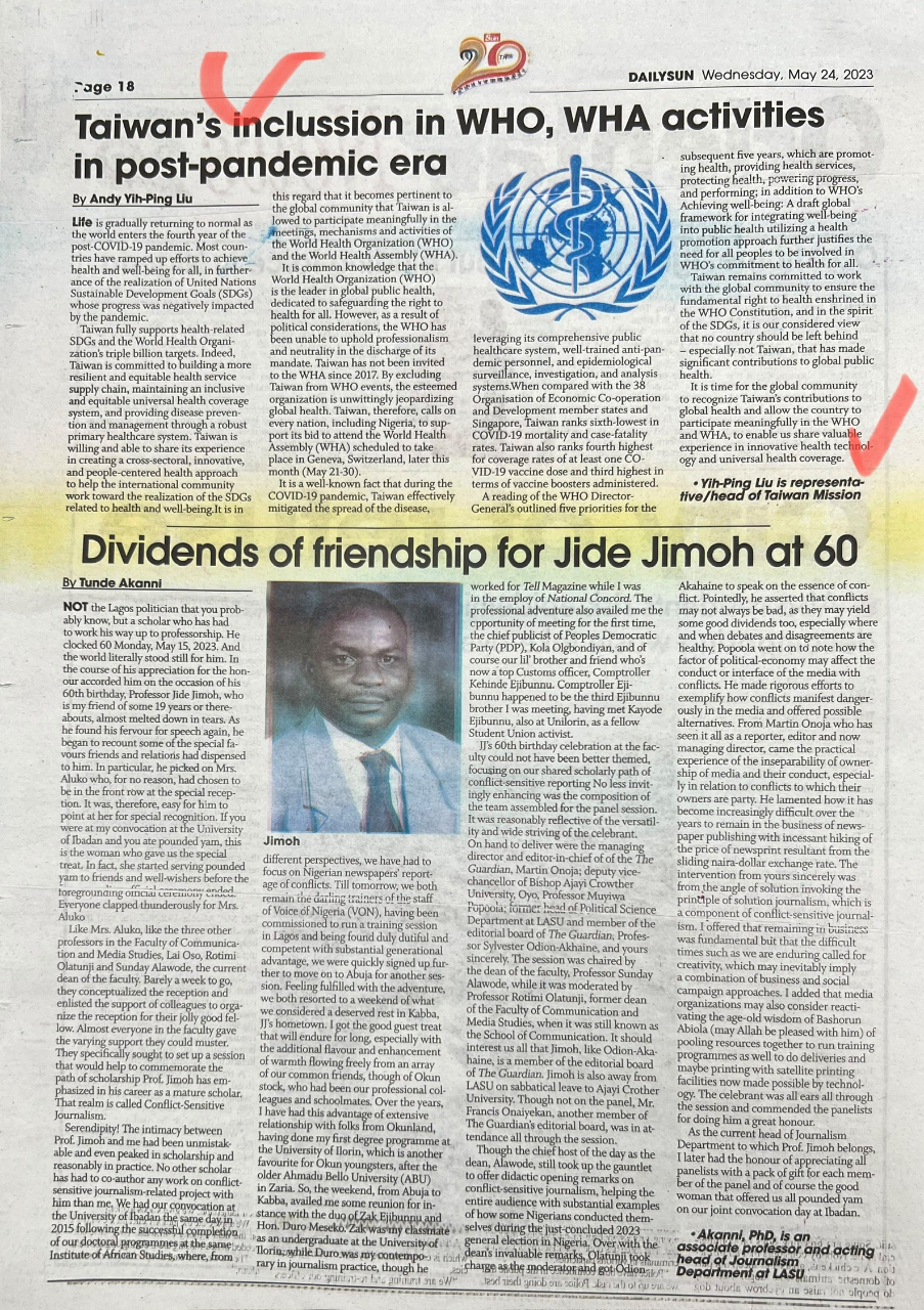 奈國主流媒體《太陽報》以顯著版面刊登本處劉代表有關推動臺灣參與第76屆世界衛生大會(WHA7... - 駐奈及利亞聯邦共和國臺北貿易辦事處 Taipei Trade Office in the Federal Republic of Nigeria ::: 跳到主要內容區塊