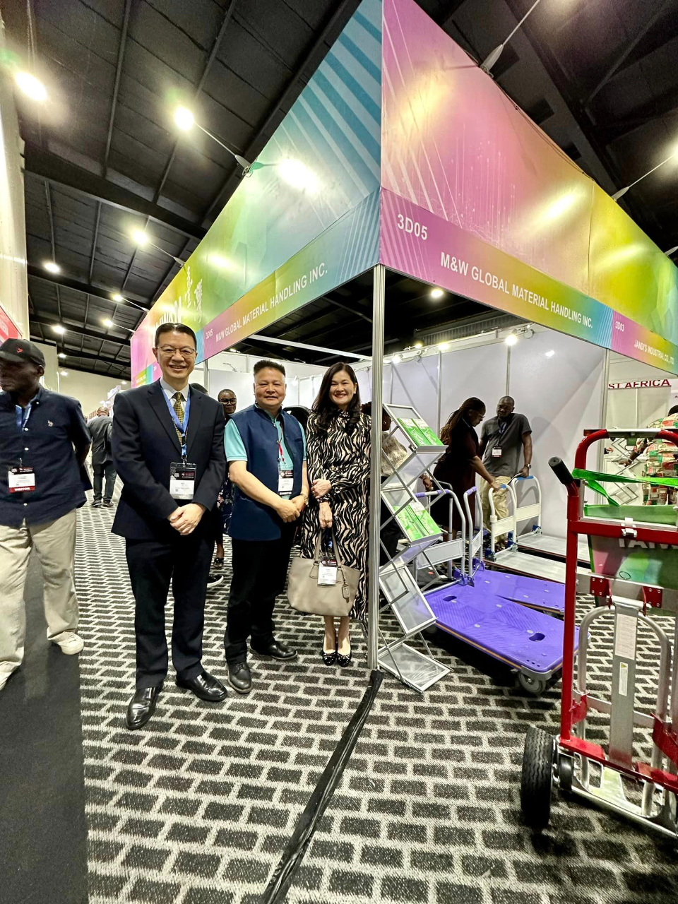 駐奈及利亞劉翼平代表夫婦與非洲台灣商會聯合總會陳淑芳總會長一起訪視了台灣主題館,也在駐拉各斯台貿中心林志都主任主持工作餐會中,就此次各具專業的台灣廠商尚宏機械、東齊興業、龍翊貿易、伊利諾企業、森鎂公司以及貿協專案經理劉育廷等,共同來奈所展出各類型包裝與食品業相關機具產品,如何在奈國與西非洲積極開拓市場,融洽深入交流各項心得。貿協為本次展覽台灣館執行單位,負責在外交部的贊助下營運台灣館。