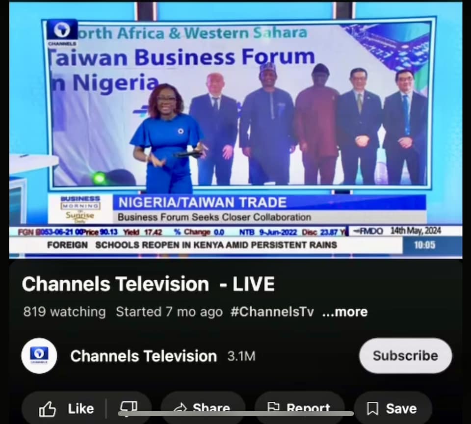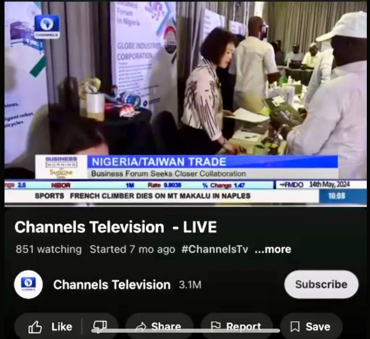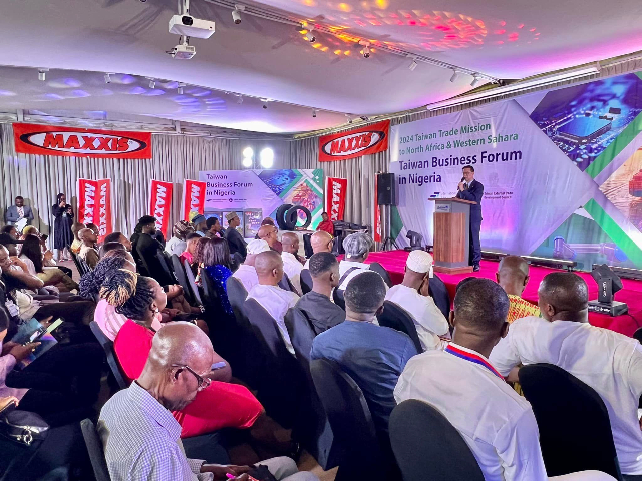 臺灣拓展奈及利亞與西非洲貿易交流團2024年5月13日在拉哥斯舉辦了「臺灣形象月」暨經貿論壇,來自臺灣9家廠商與奈國臺商會成員瑪吉斯輪胎廠皆參與了這場盛會。