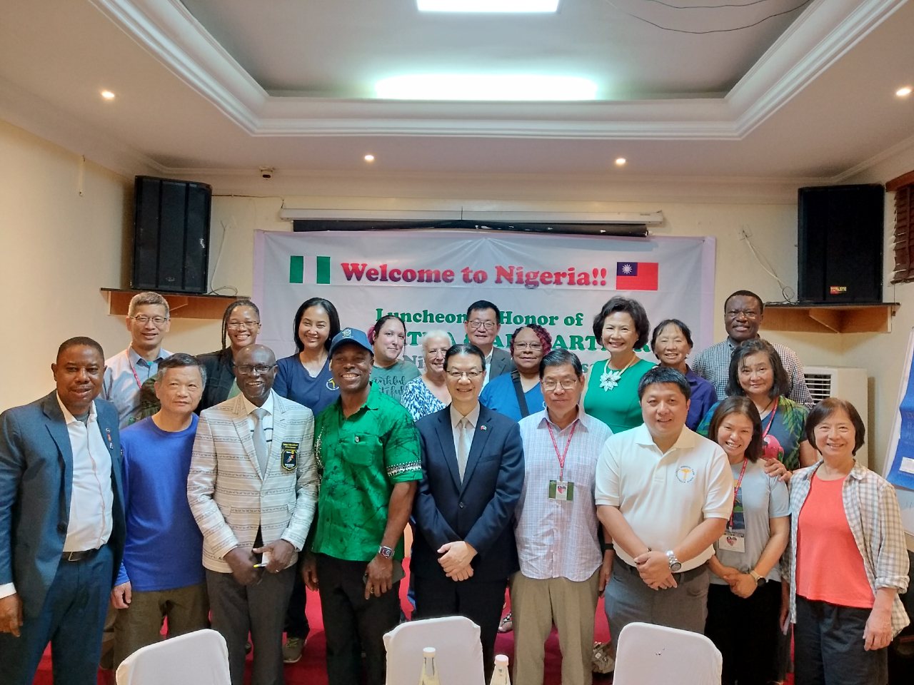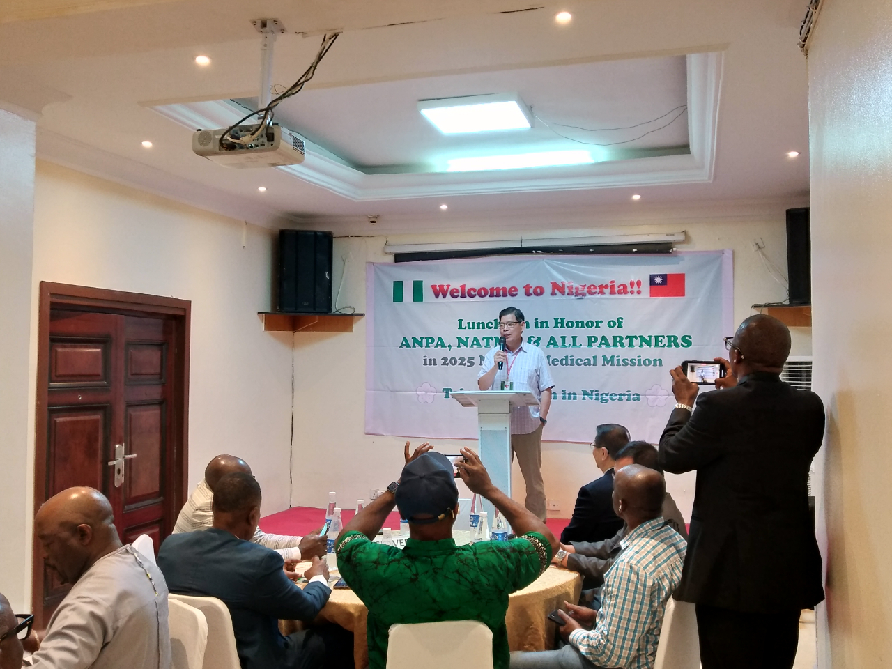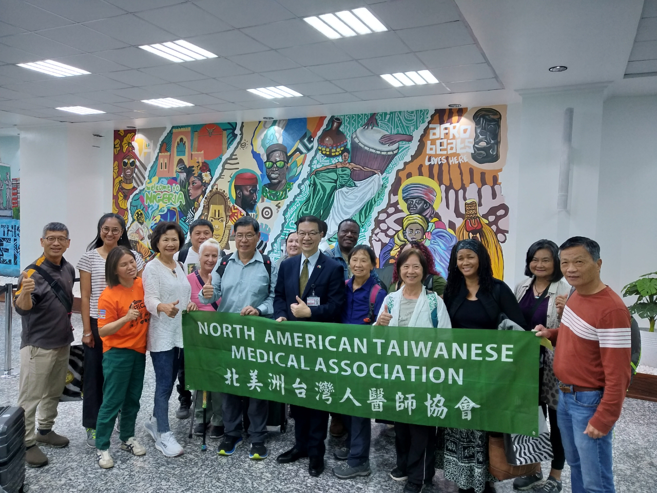 駐奈及利亞代表處劉翼平代表在北美洲台灣人醫師協會16位團員4月2、3日抵達拉哥斯機場時,安排了妥善的接機照料,還在4月3日午間舉辦歡迎北美洲台灣人醫師協會義診團工作餐會,並邀請美洲奈及利亞醫師協會會長Cliff Eke醫師以及此次義診合作夥伴拉哥斯大學教學醫院(LUTH)、聯邦醫學中心(FMC)、國際扶輪社9111與9112地區總監等,共同進行餐敘交流,以期許4月4日至9日的義診活動順利,並同時增加台灣在奈國醫療界與社會民間的國際能見度。