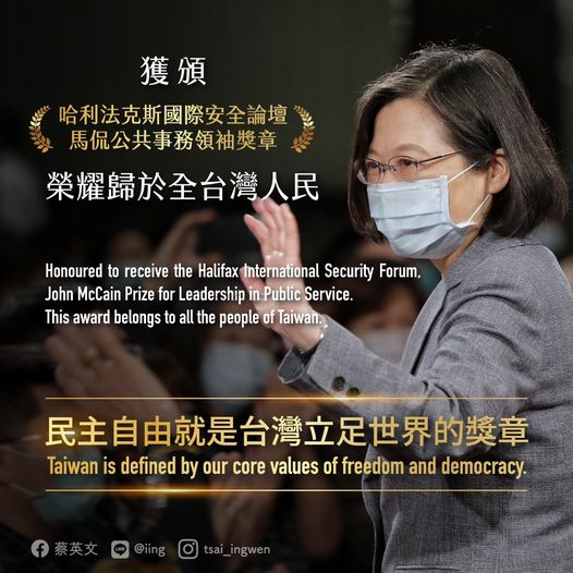 Thank you to the Halifax International Security Forum for the honour of being awarded the John McCain Prize for Leadership in Public Service. However, this award does not belong to me alone, but to all the people of Taiwan.