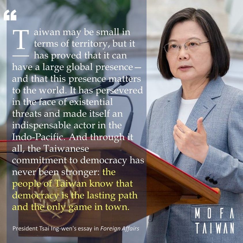 President 蔡英文 Tsai Ing-wen was invited to pen an essay in the most recent issue of Foreign Affairs magazine, titled “Taiwan and the Fight for Democracy: A Force for Good in the Changing International Order.” In the essay she pointed to Taiwan as a determined practitioner of democracy and stated our determination to be a force for good in the world in the face of contemporary challenges.