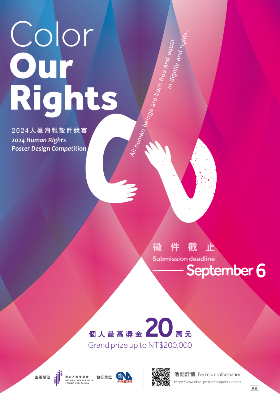 國家人權委員會為加強人權教育及交流,鼓勵各界參與人權相關活動,辦理2024年人權海報設計競賽活動,透過參賽者對當代人權議題的關注,轉化融入海報設計的創作過程,逐步體悟人權的理念及價值,提出創作成果,以提升社會大眾對於人權議題的認識。本次競賽更擴展向國際徵件,期盼透過競賽活動傳遞臺灣人權立國之形象,並普及人權理念之宗旨。