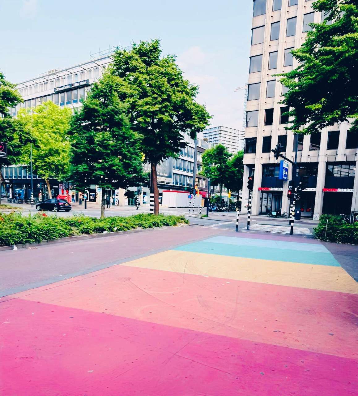 你甚至可以在某些市政廳看見彩虹旗與「進步驕傲旗」(Progress Pride Flag)一同飄揚,有些斑馬線被漆上彩虹色——在荷蘭,多元成為生活的一部分,而不是口號。