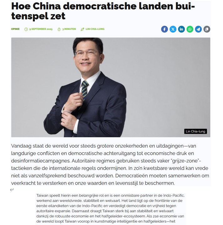第80屆聯合國大會今日開議,荷蘭主流電子新聞媒體《NieuwRechts》 9日以「中國如何排擠民主國家」為題,全文刊登外交部長林佳龍投書,呼籲國際社會拒絕中國惡意扭曲聯大第2758號決議,支持並正視台灣在國際社會應有的地位與貢獻。