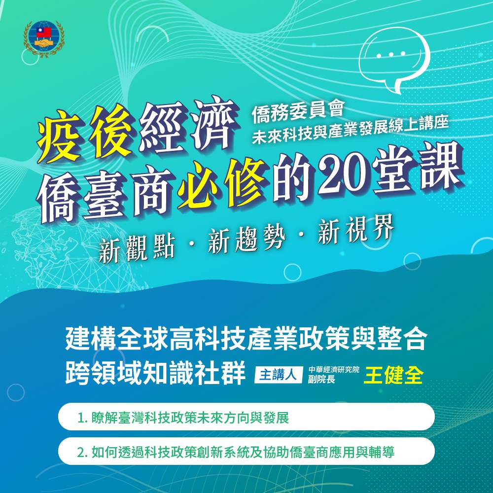 面對全球疫情衝擊,為協助僑臺商因應險峻的大環境變革,精準瞭解前瞻趨勢,洞燭產業先機,重新調整經營腳步與轉型升級,僑務委員會針對疫後僑臺商尋找經營發展的需求,專案導入國內商研機構資源,以「未來科技與產業發展」為主題,辦理「疫後經濟僑臺商必修的20堂課」線上課程,邀集臺灣頂尖研發機構及業界專家深入淺出分析全球產經變化、疫情新經濟、數位新科技、重點發展產業及臺灣未來科技與產業等。
