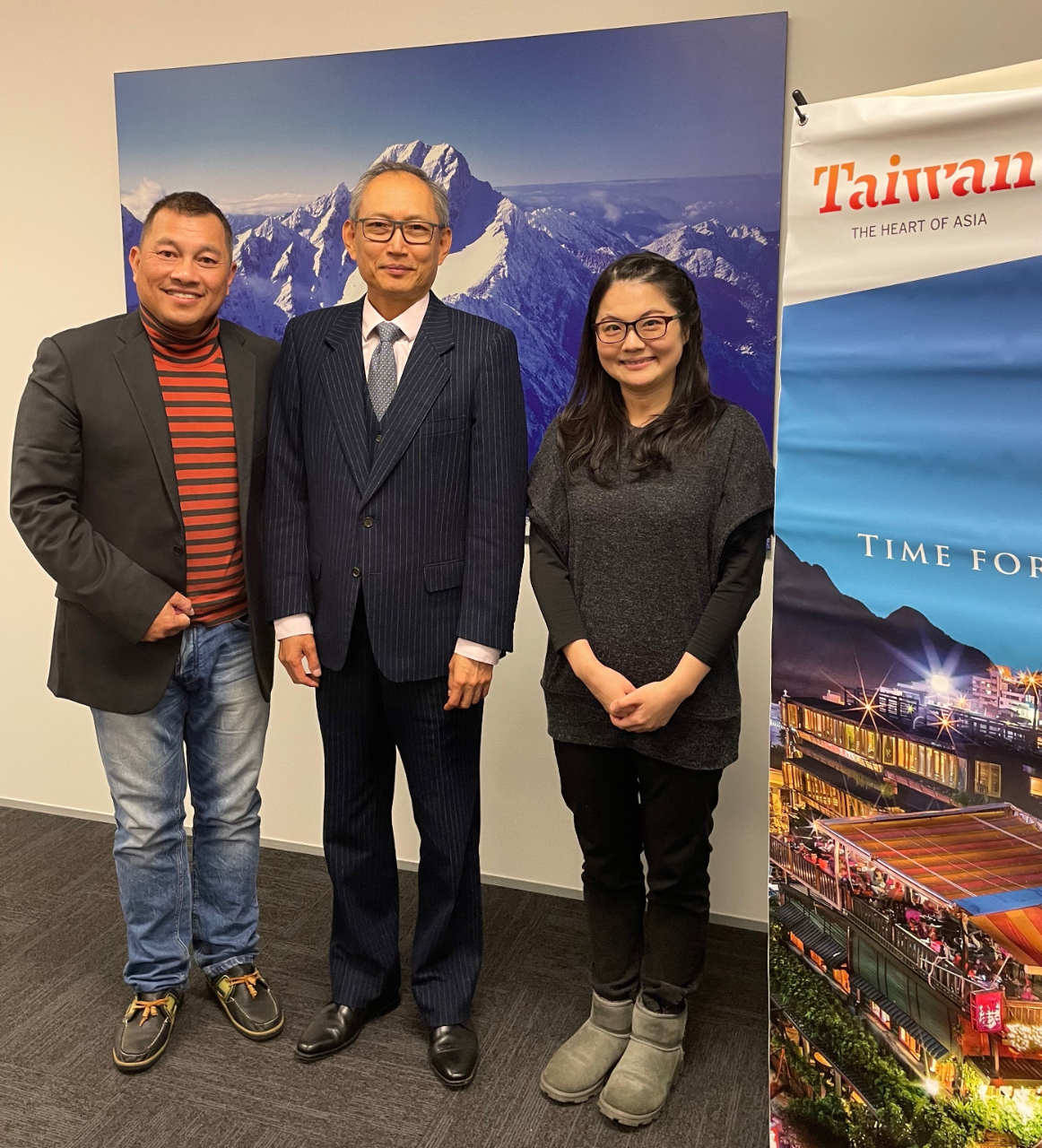 1100623 台商會長大使合影 紐西蘭台商會會長黃柏誠(左)及秘書長曾怡華(右)於6月23日拜會駐紐西蘭陳克明代表(中)