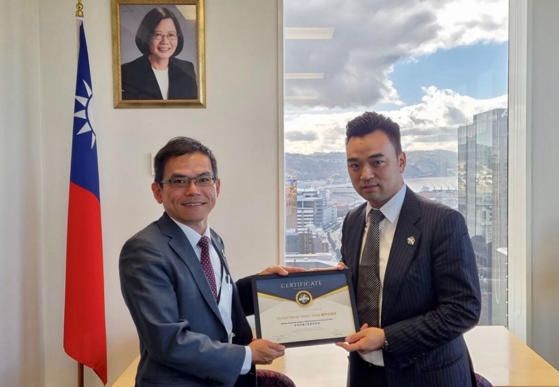 李昀翰會長(右)向經濟組鍾昇宏組長(左)遞交台商會顧問聘書