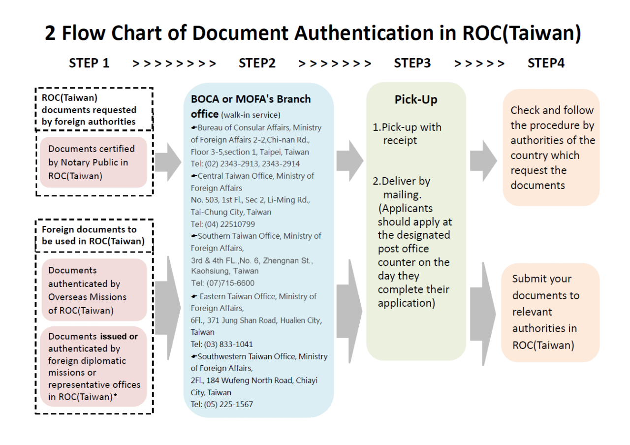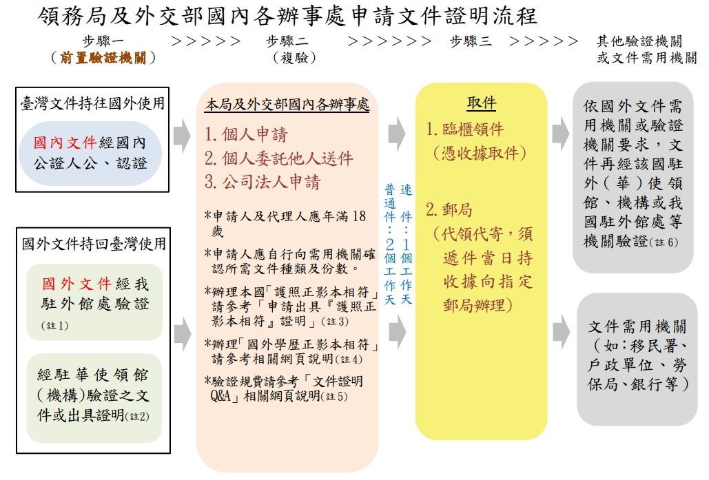 台灣地區各機關所核發之文件,如果需要本處認證,該份文件必須先經過台灣各地方法院公證處、及外交部領事事務局的認證,本處始得受理驗證。