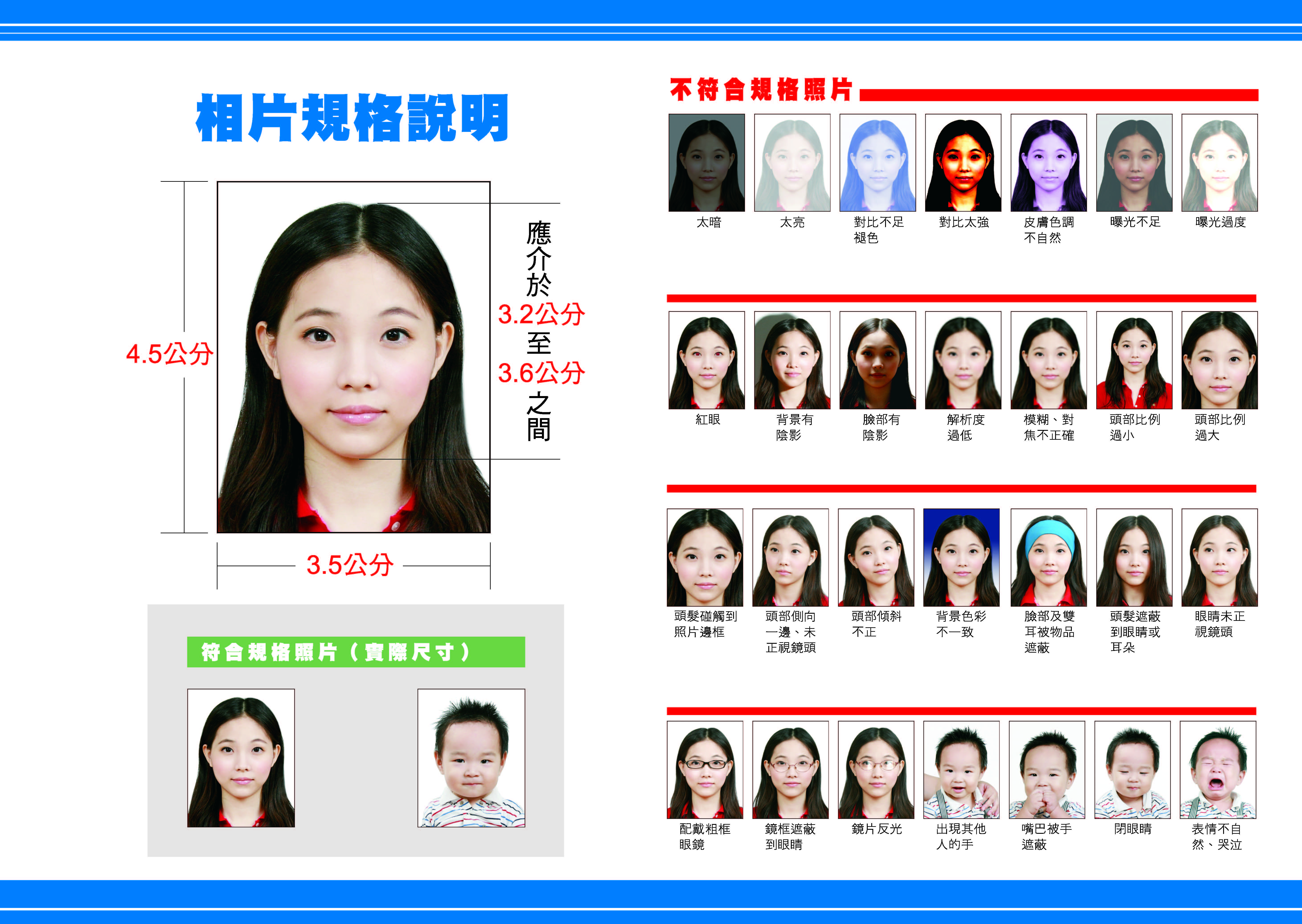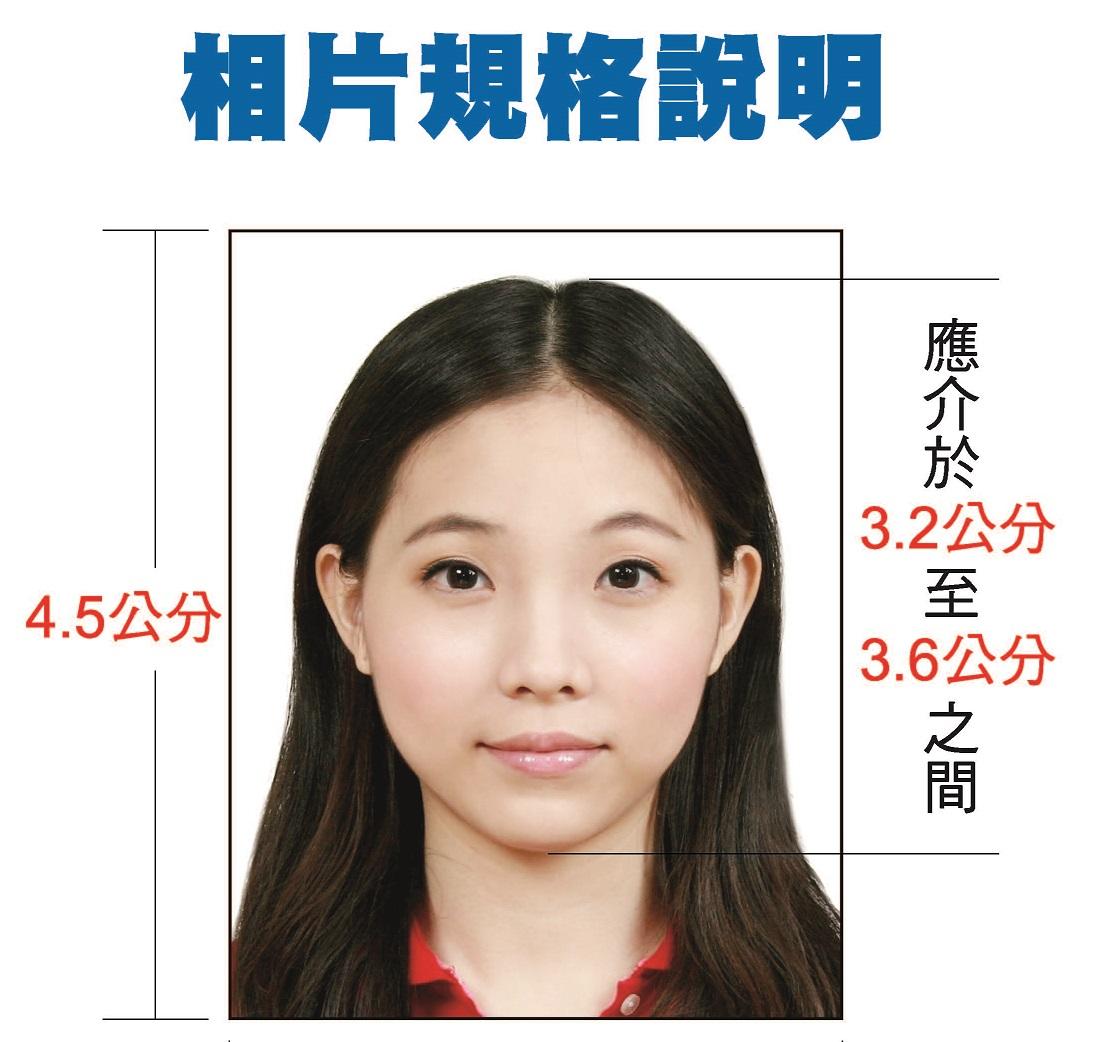 相片規定(務必符合以下規格):最近2年內所拍攝之直4.5公分,橫3.5公分、彩色、脫帽、未戴有色眼鏡,五官清晰、不遮蓋五官,足資辨識人貌、未經修改或合成、人像自頭頂至下顎之長度介於3.2公分至3.6公分之白色背景正面半身薄光面紙照片1張。請於線上系統登錄時掃瞄上傳。