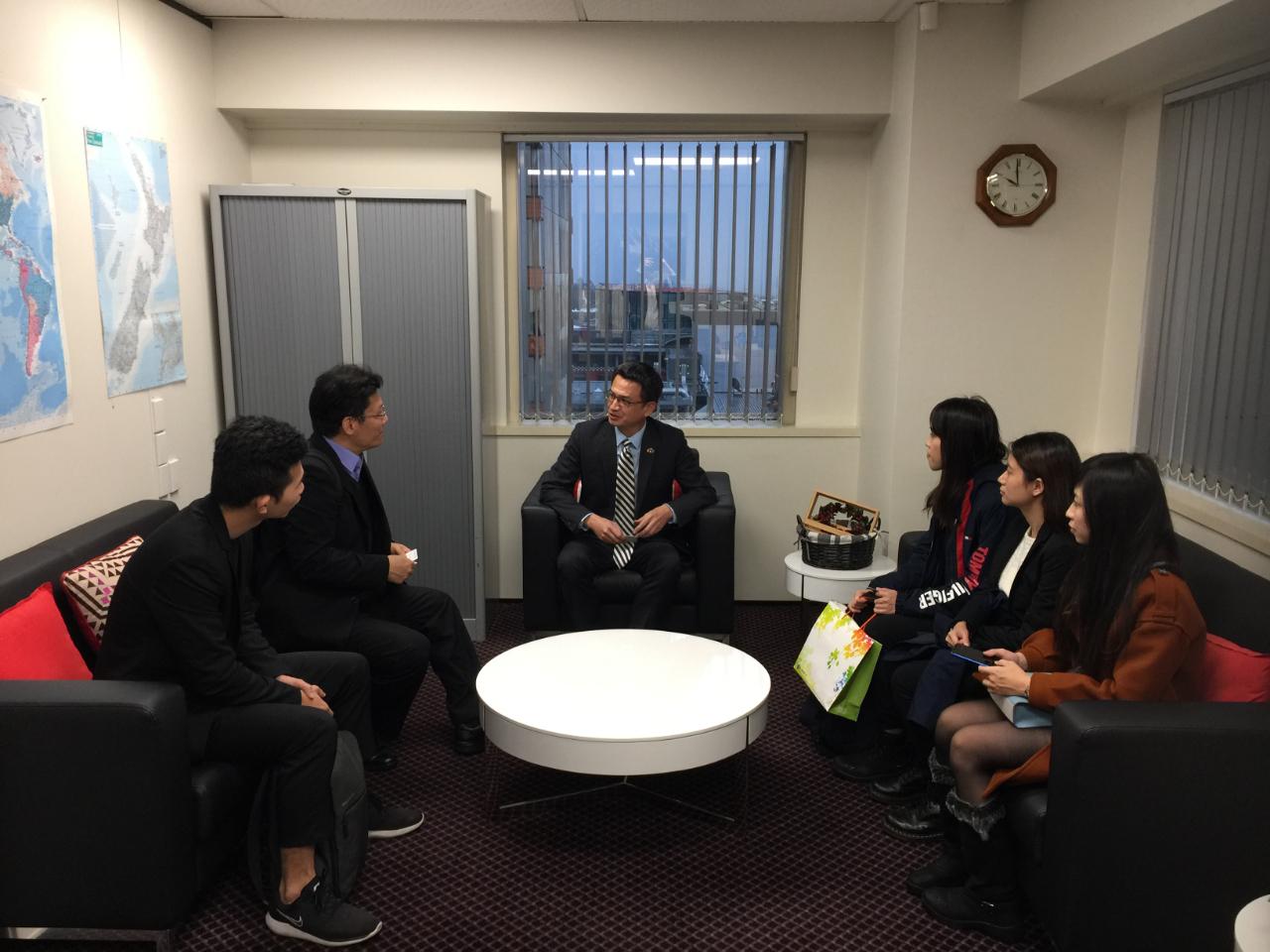 本處劉永健處長於7月19日上午10時接待來處拜會之國立臺灣師範大學運動休閒與餐旅管理研究所方進義教授與4名研究生,方教授表示紐西蘭為我國「新南向政策」目標國之一,此行接受教育部體育署補助,目的在於瞭解紐西蘭運動休閒環境之營造以及相關產業之發展、與姊妹校Auckland University of Technology洽談雙學位計畫,以及拜會我國駐外單位瞭解在紐西蘭之駐外工作現況。
