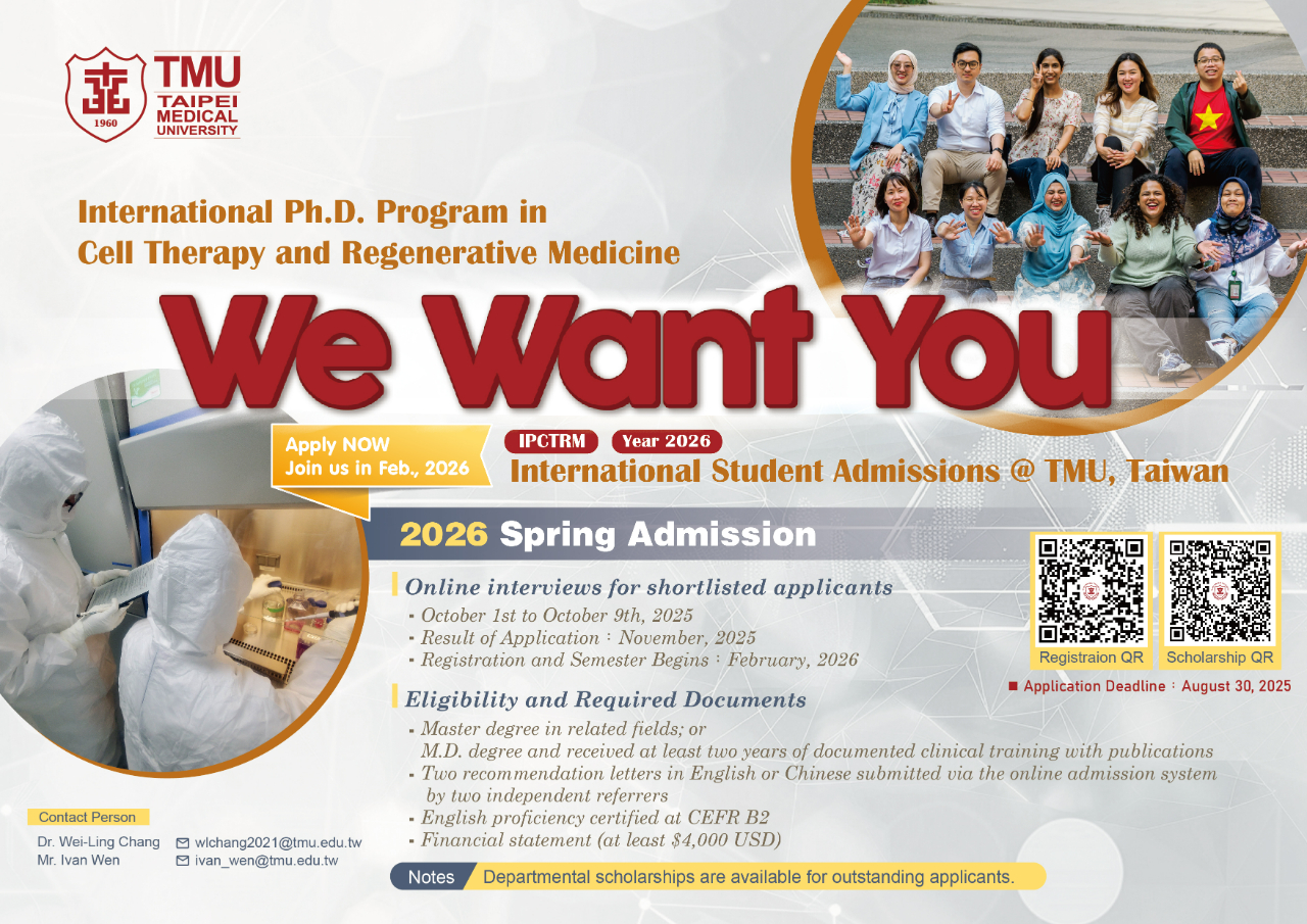 2026 TMU Spring Graduate Admissions. Welcome to join us[https://medicine-en.tmu.edu.tw/research/departments/ipctrm/]