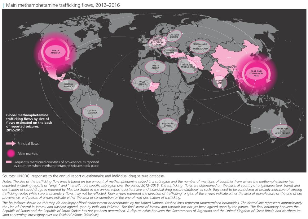 聯合國毒品暨犯罪辦公室(UNODC)2018年「世界毒品報告」(World Drug Report 2018)指出北美與東亞、東南亞地區是全球安非他命的主要生產製造與消費地區。