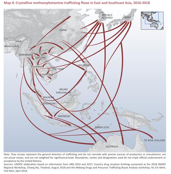 2019年7月18日聯合國毒品暨犯罪辦公室公布2019年「東南亞跨國組織犯罪:演變、成長和影響」報告(Transnational Organized Crime in Southeast Asia: Evolution, Growth and Impact)指出,以澳門、香港、中國大陸和泰國為據點的大型犯罪組織和金主,與來自臺灣的犯罪網絡以及製毒師合作,成為東南亞製造和販運甲基安非他命及其他毒品的主力。
