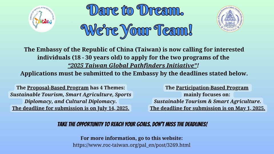 Dare to Dream! We’re your team! Dear Palau youths, 18-30 year-old, welcome to explore a journey in Taiwan. Taiwan Global Pathfinders Initiative is calling applications for Taiwan Dreamer Program, Participation-based program and a Proposal-based program.