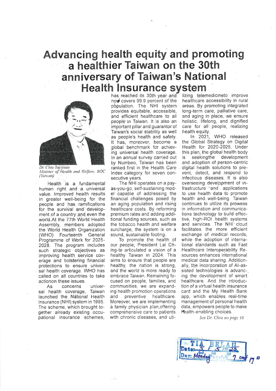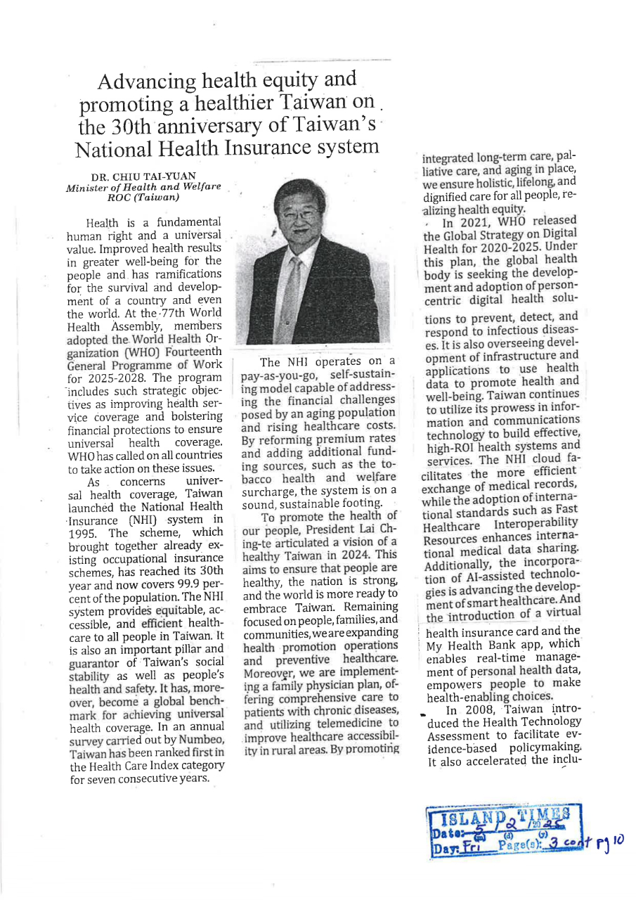 Advancing health equity and promoting a healthier Taiwan on the 30th anniversary of Taiwan’s National Health Insurance system
