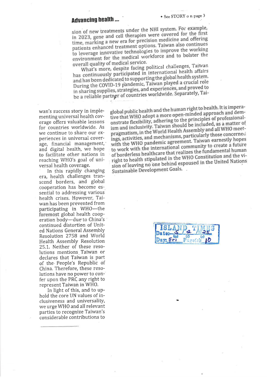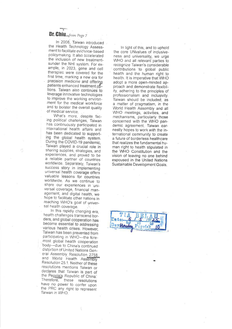 Even without WHO membership, Taiwan remains a committed global health partner. We urge the international community: health knows no borders—Taiwan must not be left behind.